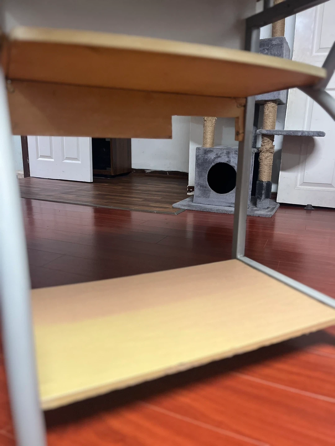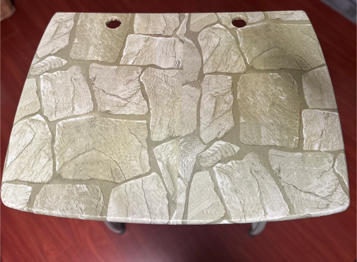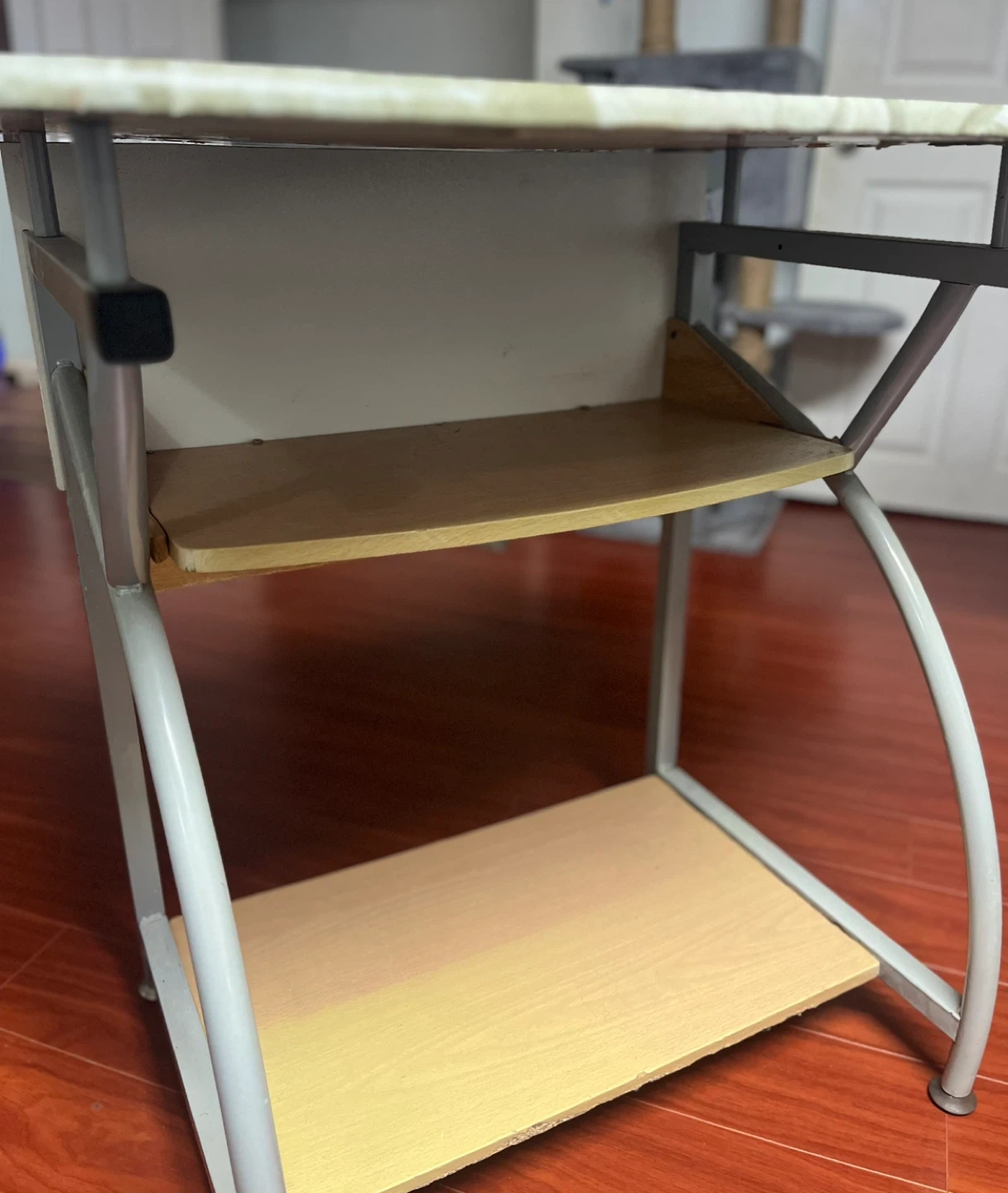 Selling a small desk that's perfect for a compact space! It features a unique stone pattern on the top surface. There's also a shelf underneath for extra storage. It's in good condition and ready for a new home