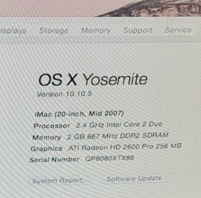 Selling an iMac 20-inch (Mid 2007) running OS X Yosemite. It has a 2.4 GHz Intel Core 2 Duo processor, 2 GB 667 MHz DDR2 SDRAM, and ATI Radeon HD 2600 Pro 256 MB graphics. It's in used condition with some cosmetic wear.