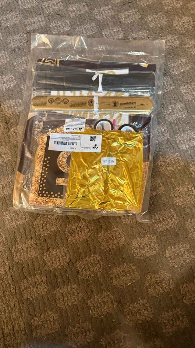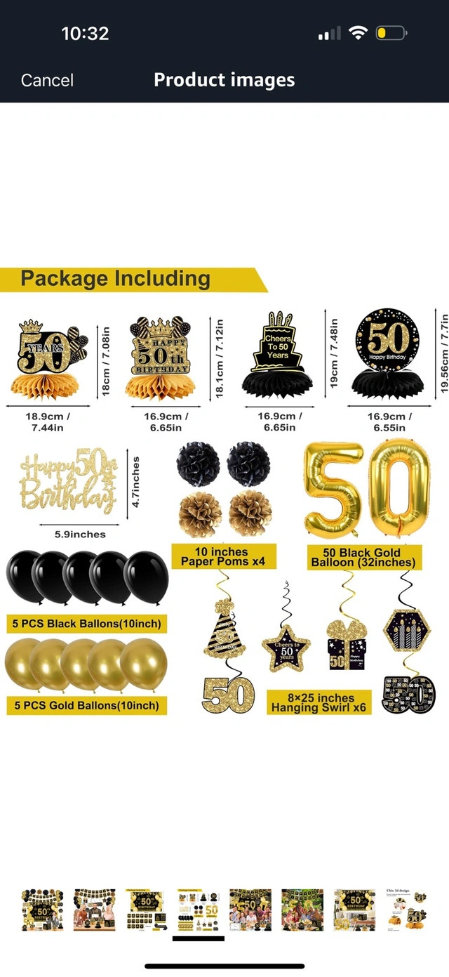 10We never used this decoration because we decided not to decorate. It’s still in packaging. Decorate for a 50th birthday! 32 pieces set includes: - 150x89cm 50th Birthday Banner Backdrop*1 - 50th Poster Anniversary Card*1 - "HAPPY 50TH BIRTHDAY" banner * 1pc - 10 inch Paper Pom Poms*4 - Numeral 50 Balloons *1 - Hanging Swirl*6 - 50th birthday Cake Topper *1 - "IT'S MY BIRTHDAY" Sash*1 - Honeycomb Table Topper*4 - Atex balloons*10 Original paid $36