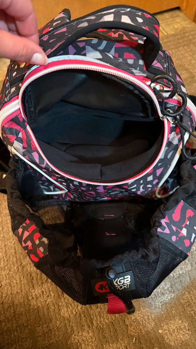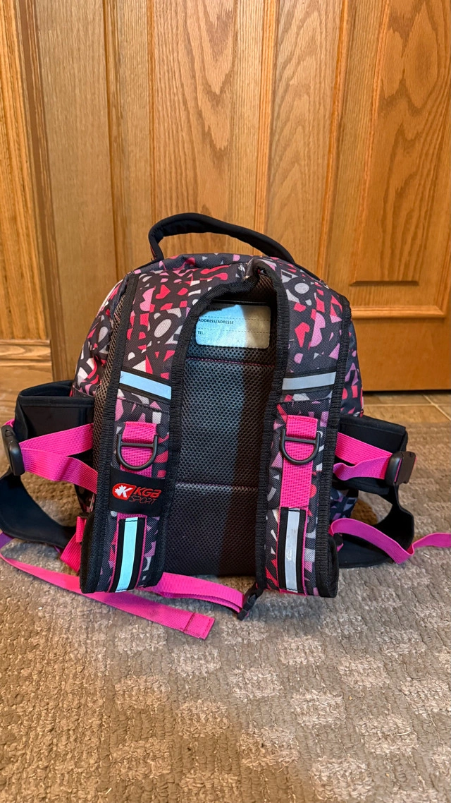 10This is a KGB Sport kids' boot backpack, designed with a fun pink and black pattern, perfect for carrying ski or snowboard boots and gear to the mountain. This used backpack is in great condition. Here are some features of the backpack: * Spacious main compartment * Side pocket for carrying boots * Front accessory pocket (Helmet) * Padded shoulder straps * Durable construction If the ad is up, it's still available, so no need to ask!