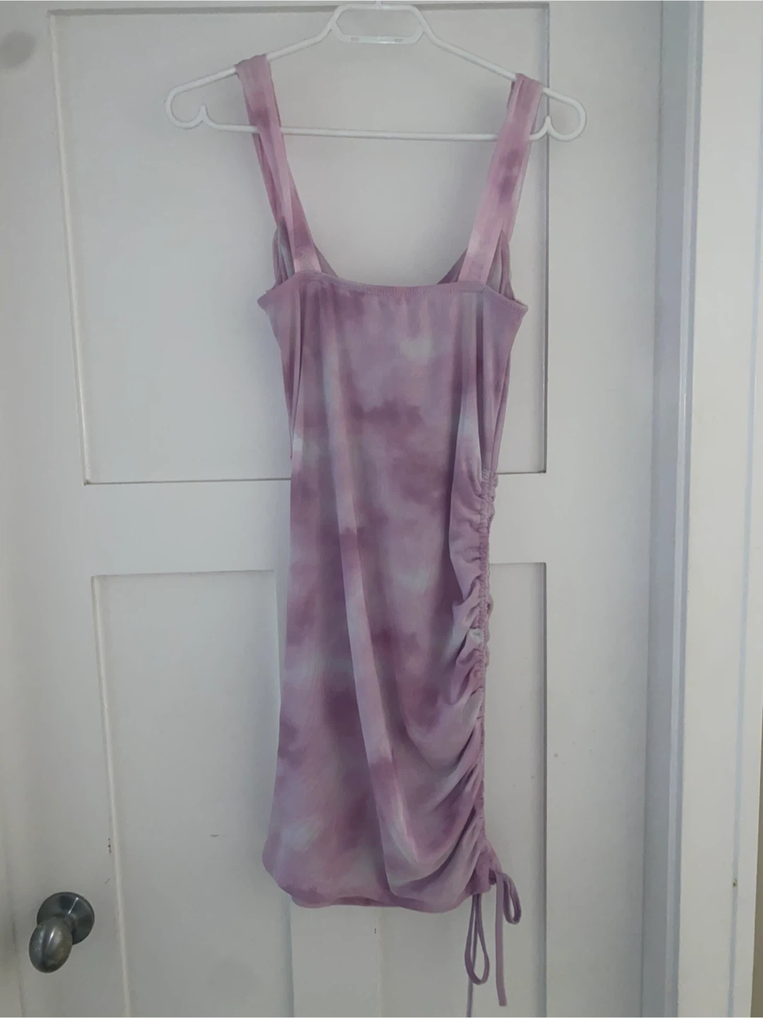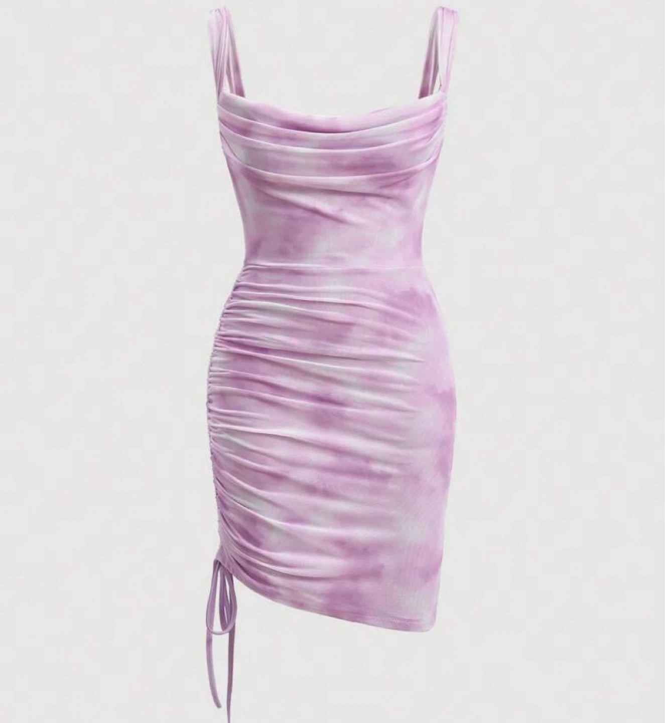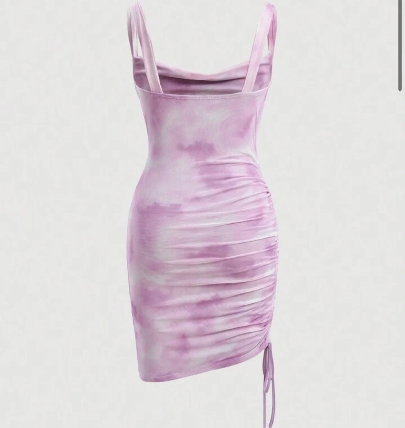 Cute tie dye mini dress in a purple/pink and white pattern! It features a cowl neck and adjustable straps. The dress has a ruched detail on one side with a drawstring. Perfect for a night out or a casual day!