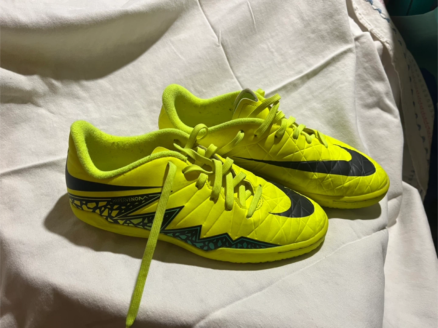 Selling a pair of Nike Hypervenom indoor soccer shoes in a vibrant yellow colour! They're in great shape and ready for some action on the field. The size is 4.5Y (youth).