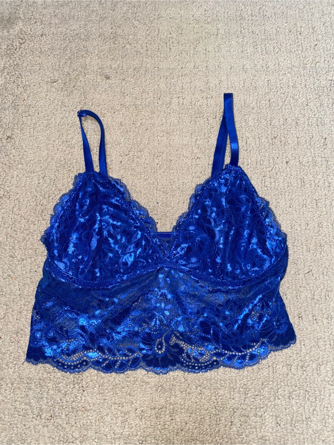 174Selling a cute blue lace bralette! It's in great condition and ready for a new home. The lace detailing is really pretty, and the colour is a vibrant blue. Perfect for layering or wearing on its own! Size small / XS