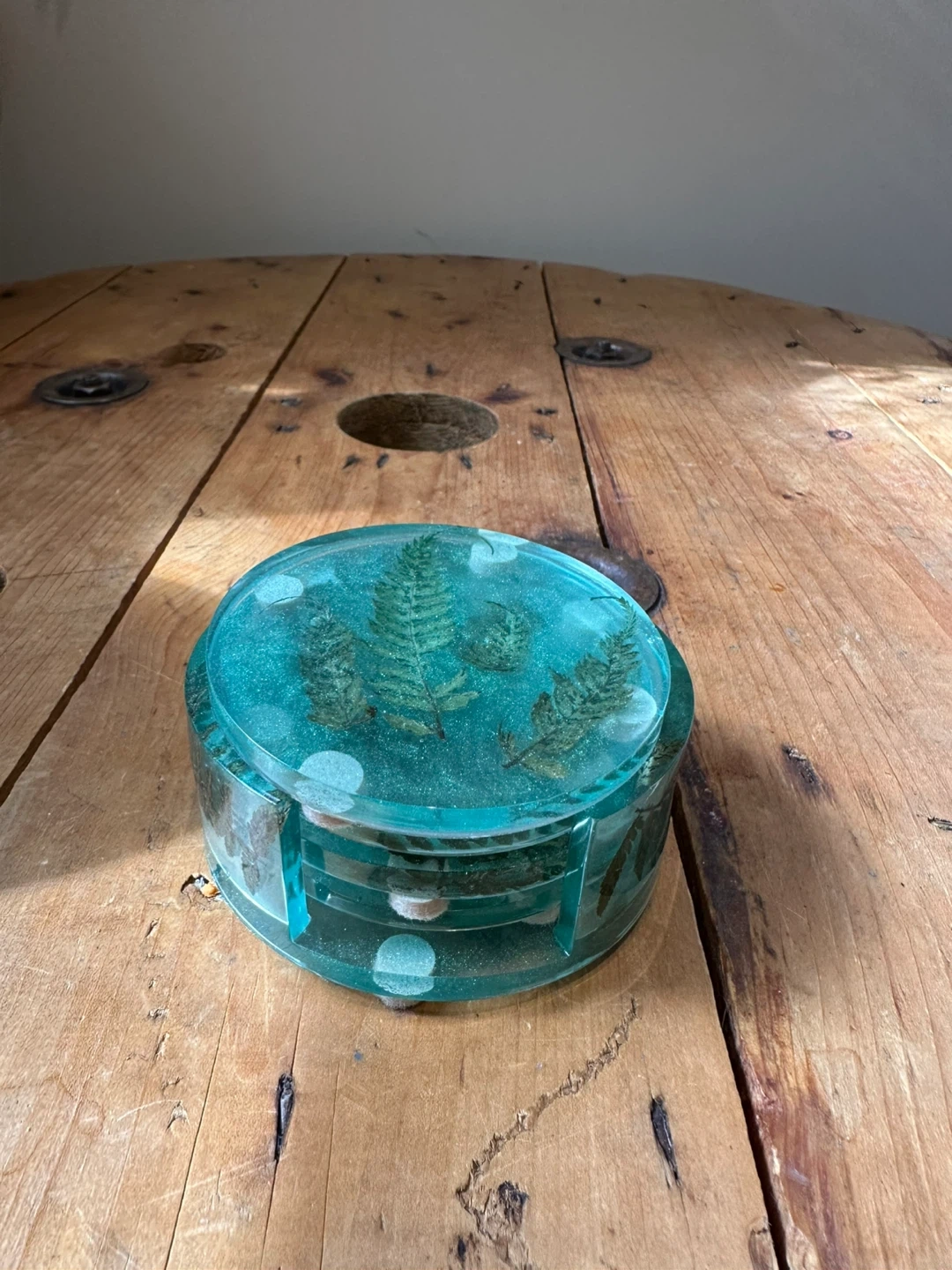 15Check out this unique set of handmade resin coasters! They feature real ferns encased in coloured resin, adding a touch of nature to your home decor. Perfect for protecting your surfaces in style