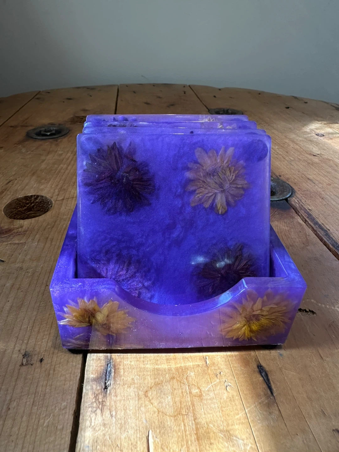 15Selling a handmade coaster set, perfect for adding a unique touch to your home! This set includes four coasters and a matching holder, all made with beautiful purple resin and embedded with dried flowers. They're in great condition and ready to protect your surfaces in style