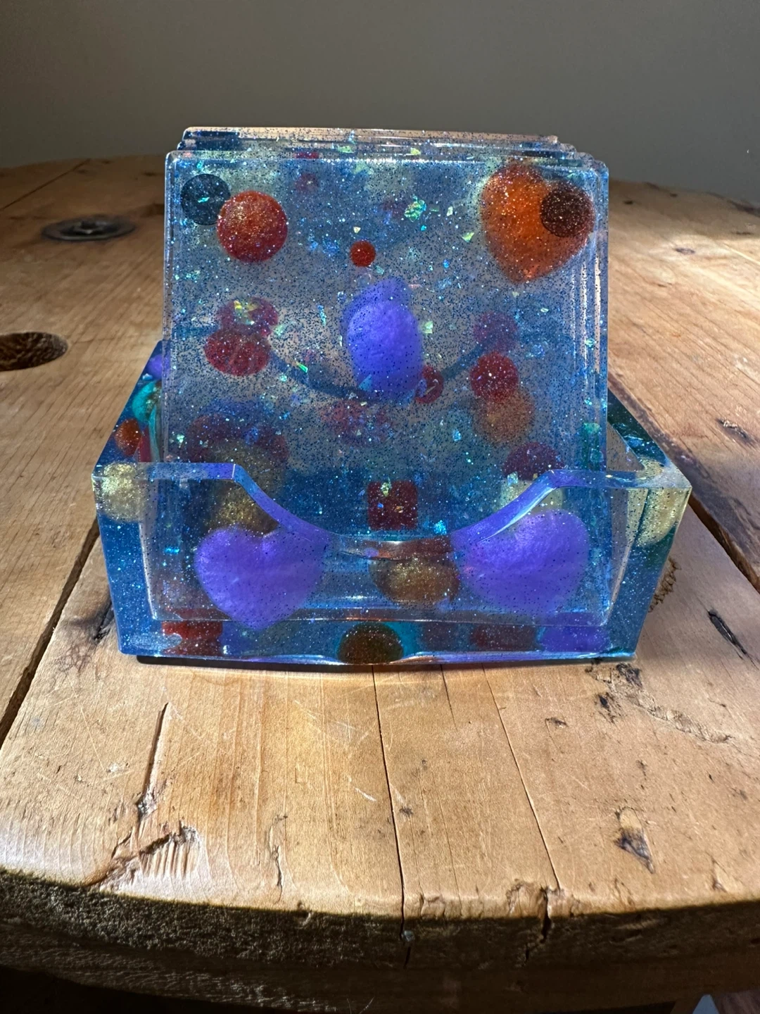 15Selling a unique handmade resin coaster set! It comes with four coasters and a matching holder. The coasters have a clear resin base with colourful embedded decorations. Perfect for adding a touch of whimsy to your coffee table or bar area.