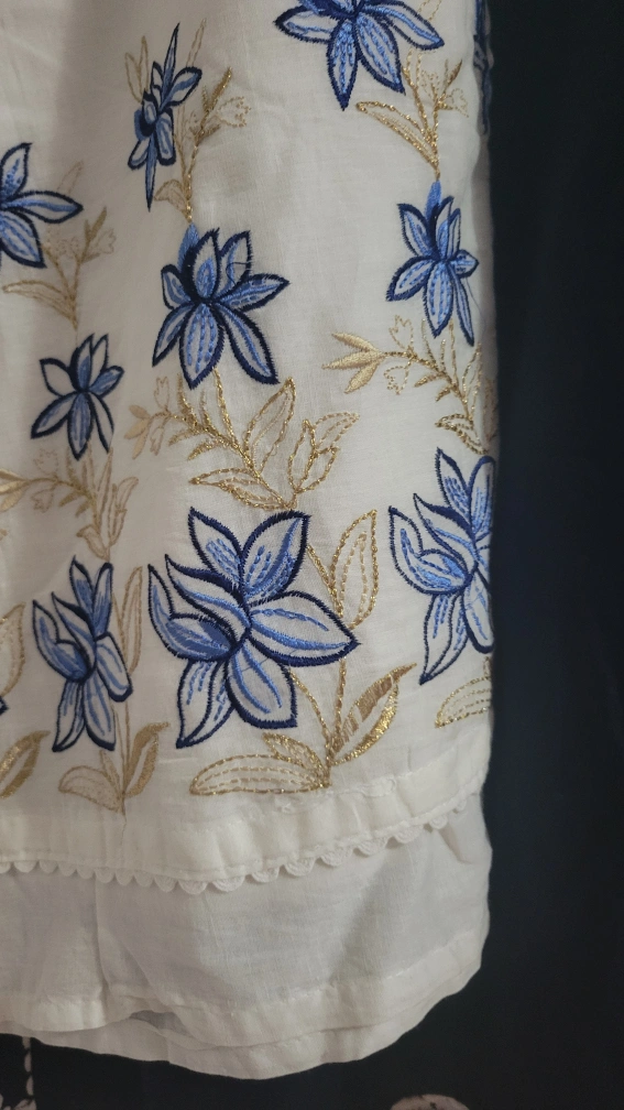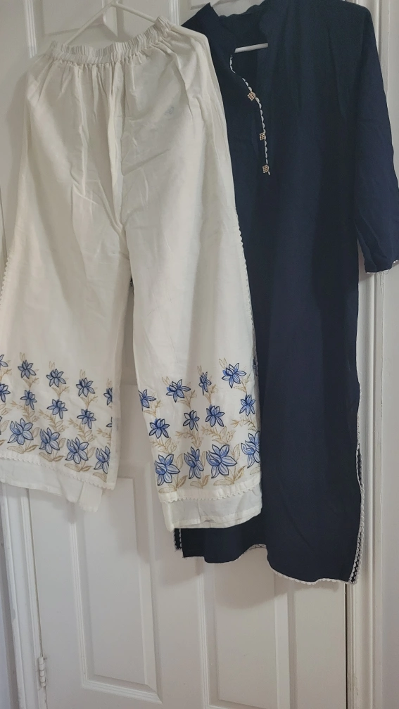 10Ladies' dress set in dark blue and white, perfect for any occasion! The set includes a long-sleeved black top with decorative buttons and white pants with floral embroidery at the bottom