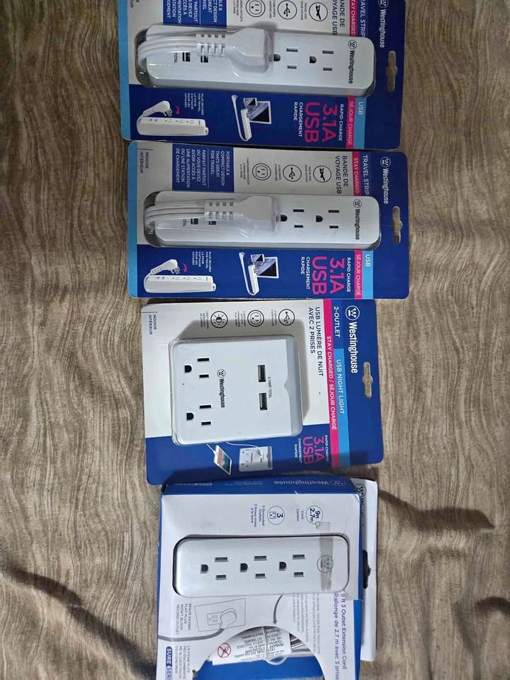 83Westinghouse travel strips and a dual extension cord. Includes 3 Westinghouse travel strips with USB ports (3.1A charging) and 1 dual extension cord, all in original packaging. Perfect for travel or home! Pick up in Hamilton Mountain near Mohawk College.