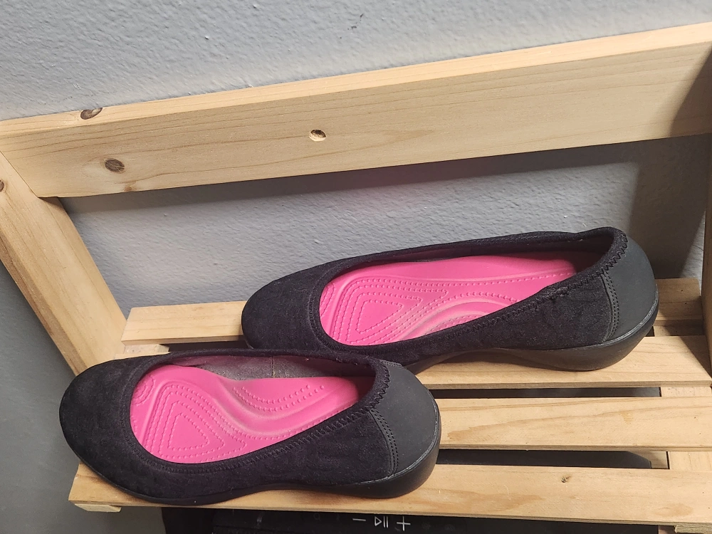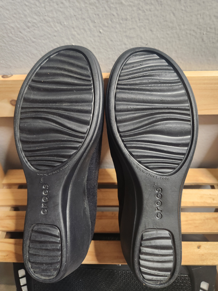 Selling a pair of black Crocs wedge size 7 shoes. They have a comfortable footbed and are in great condition. Perfect for everyday wear! The shoes turned out too big for me. Worn a few minutes only because it keeps slipping off and I just gave up. I normally wear size 7 for dress shoes but this is big for me.