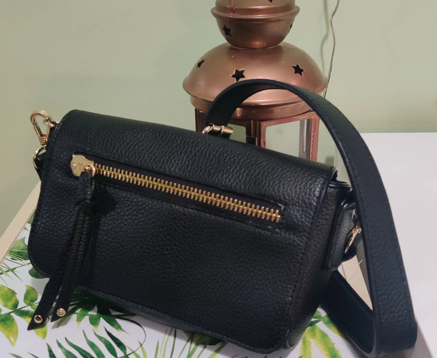 Black crossbody clutch from Indigo. one outside zipper pocket, one inside zipper pocket, back pocket. magnetic fold-over closure. comes with removable crossbody strap. gold hardware. like new condition!