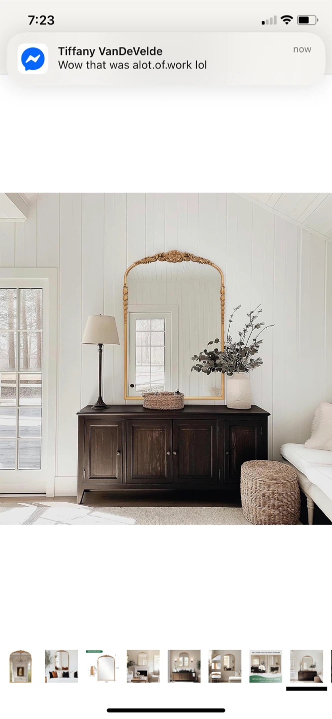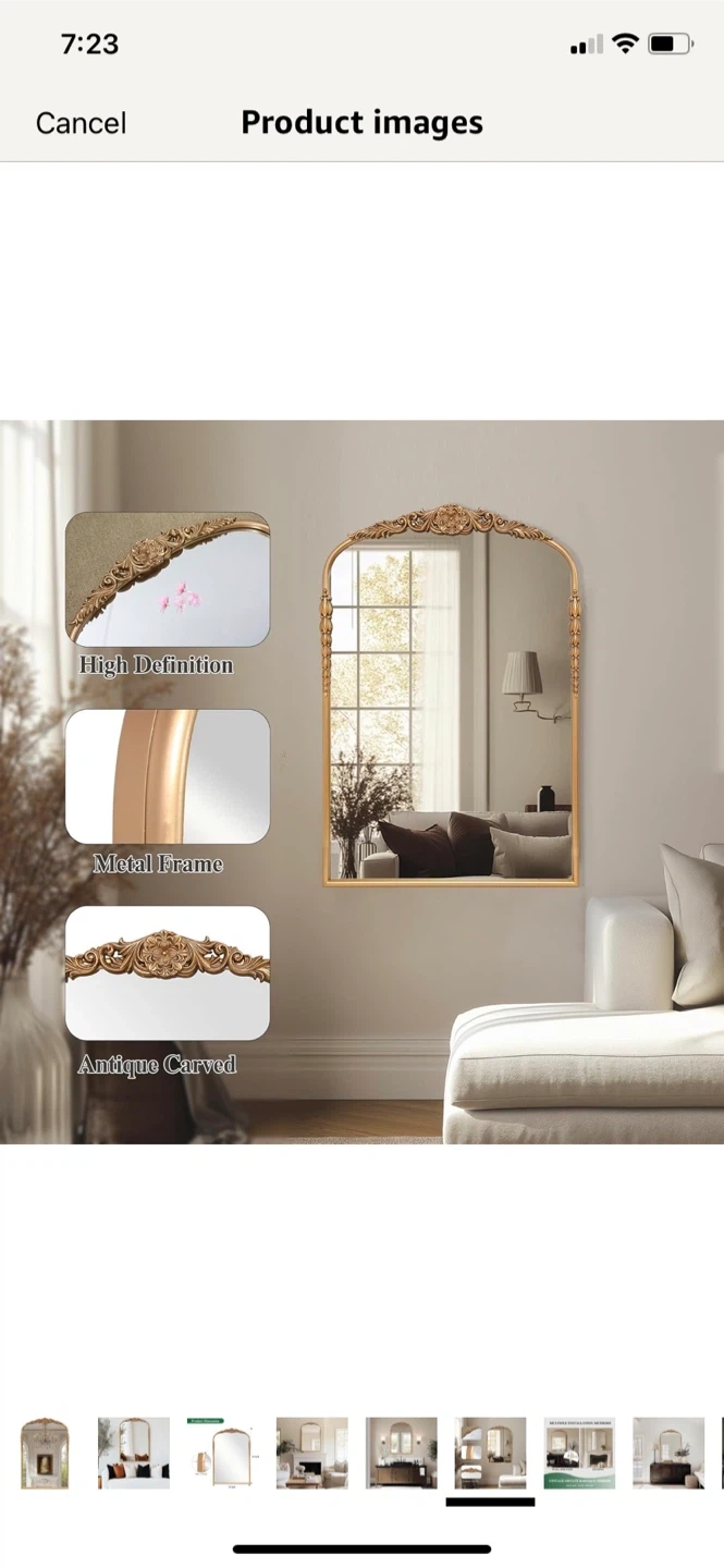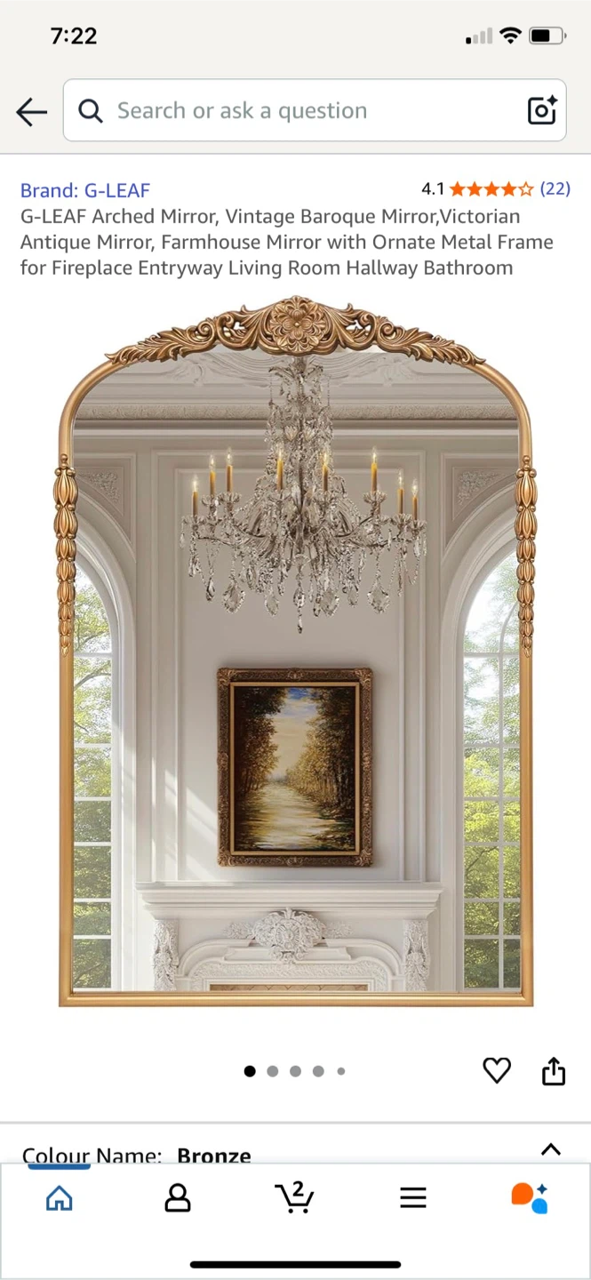 Copper Color. Elevate your decor with this vintage ornate baroque mirror! It's a G-LEAF arched mirror with a Victorian antique design. The frame is metal with antique carved details. It can be wall-mounted or leaned against the wall for versatile installation. Dimensions are 24 inches wide and 36 inches tall.