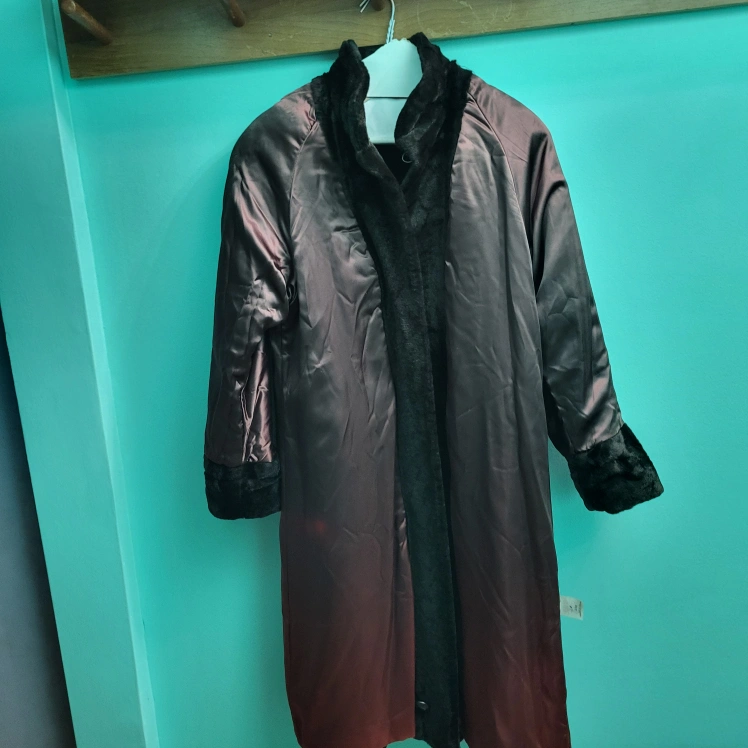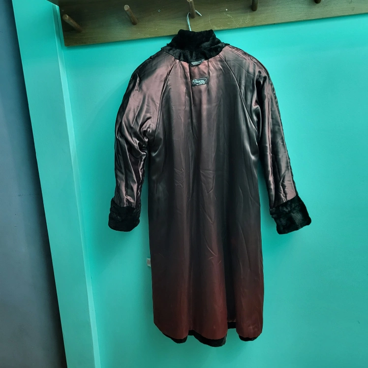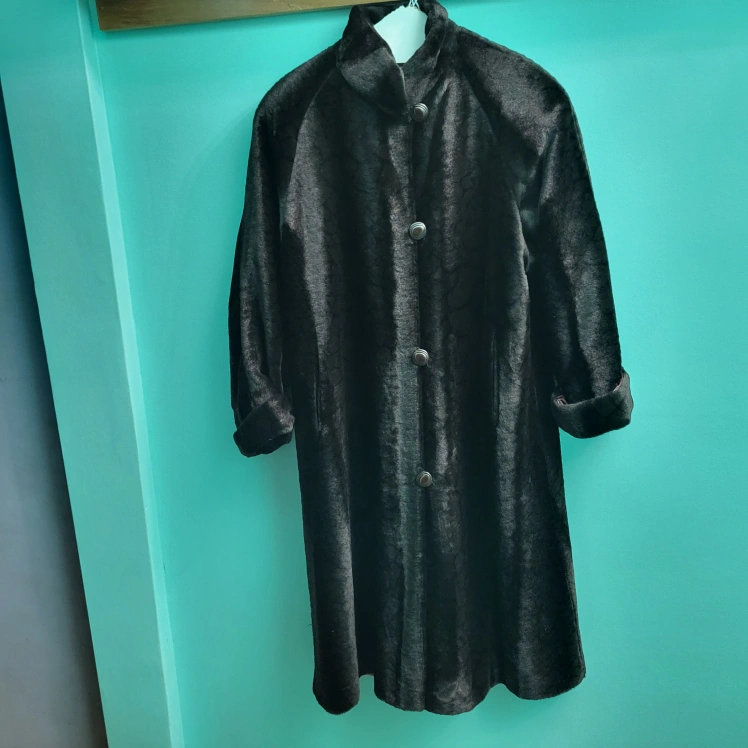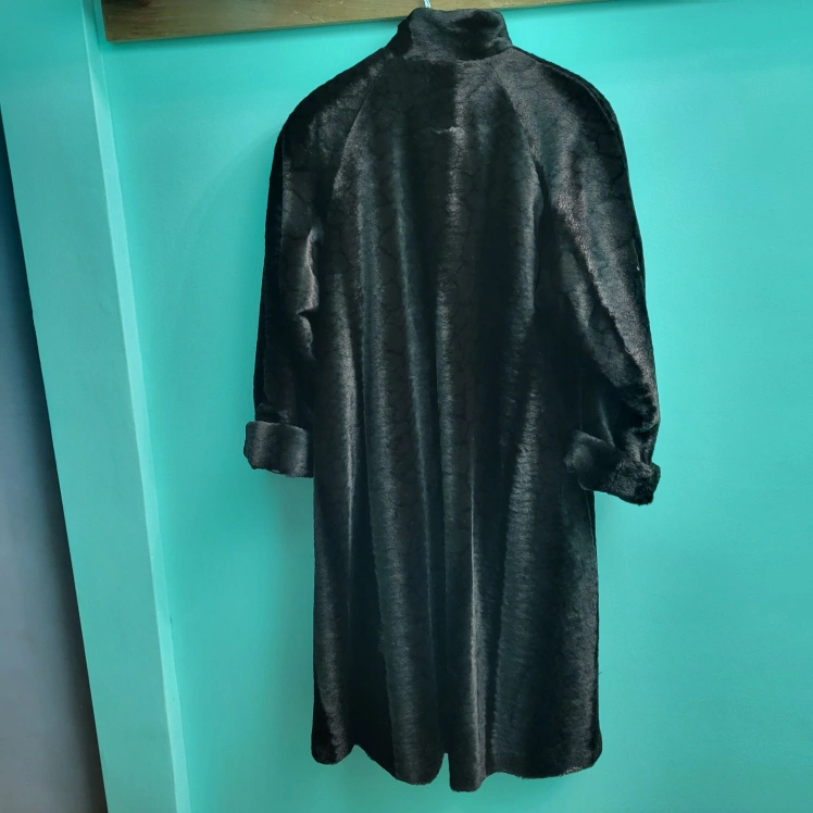 Selling a vintage long black fur coat. It is in great condition and ready for a new home! The coat has a unique design and is perfect for keeping warm during the colder months.