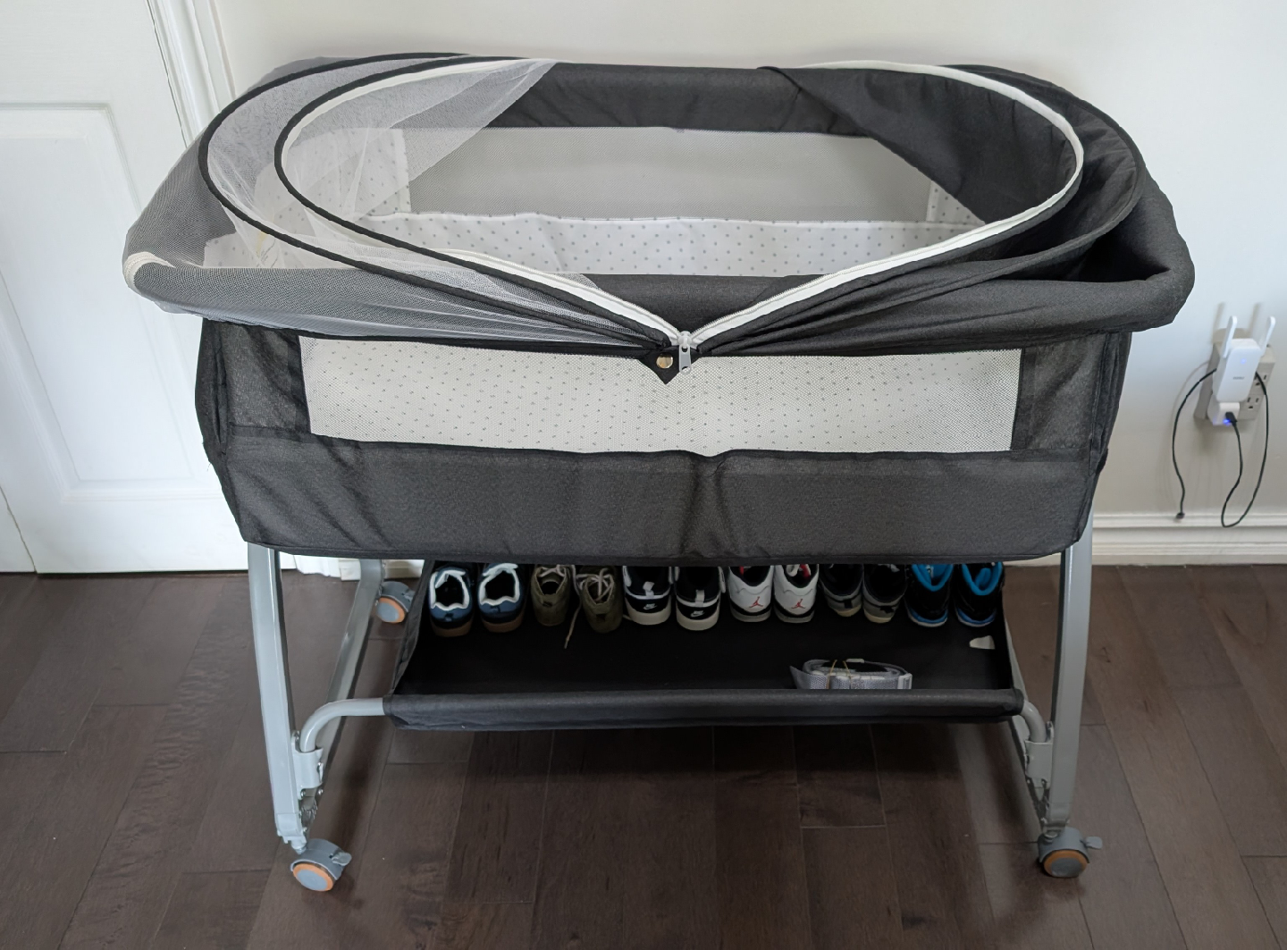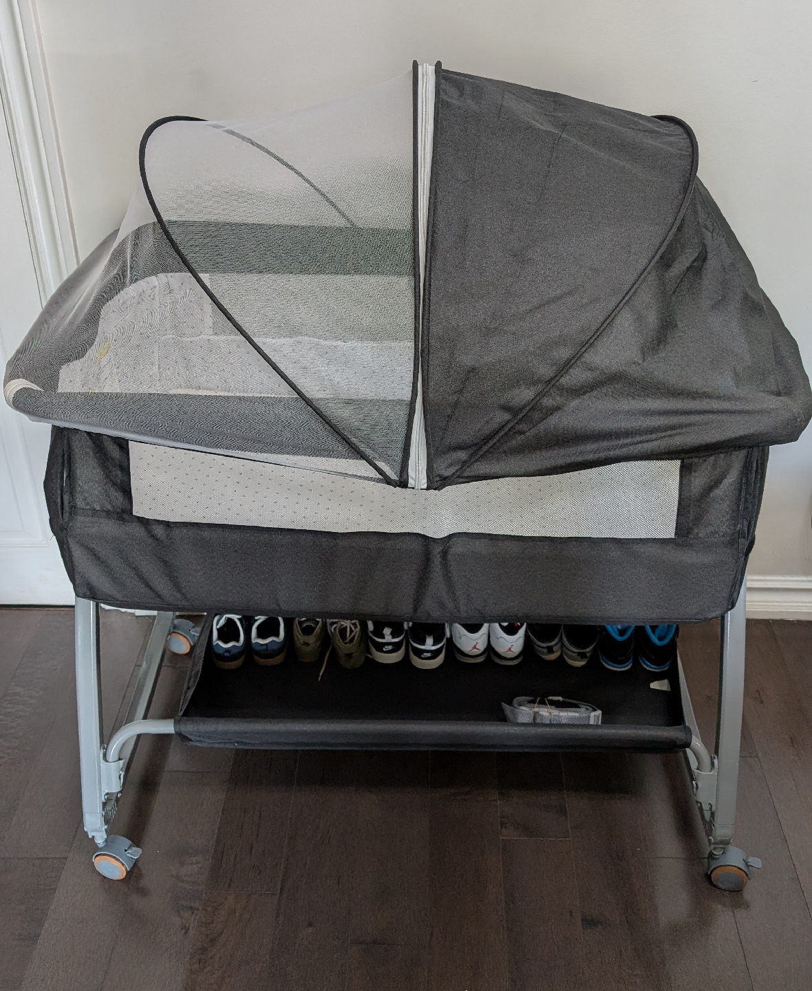 It features a swing base and mosquito net to keep your little one protected. The bassinet is grey and has a convenient storage shelf underneath. Perfect for newborns and infants!