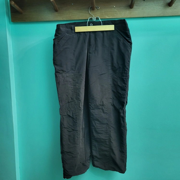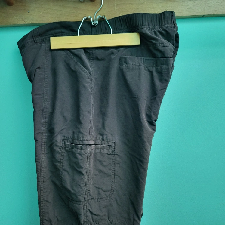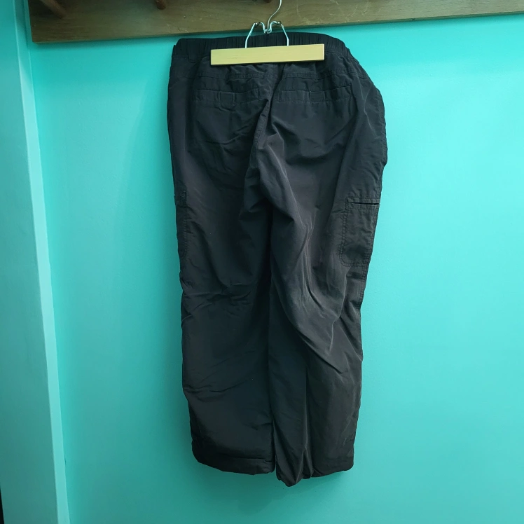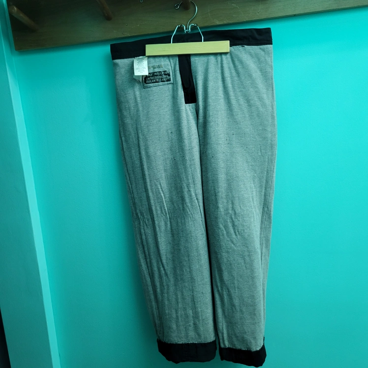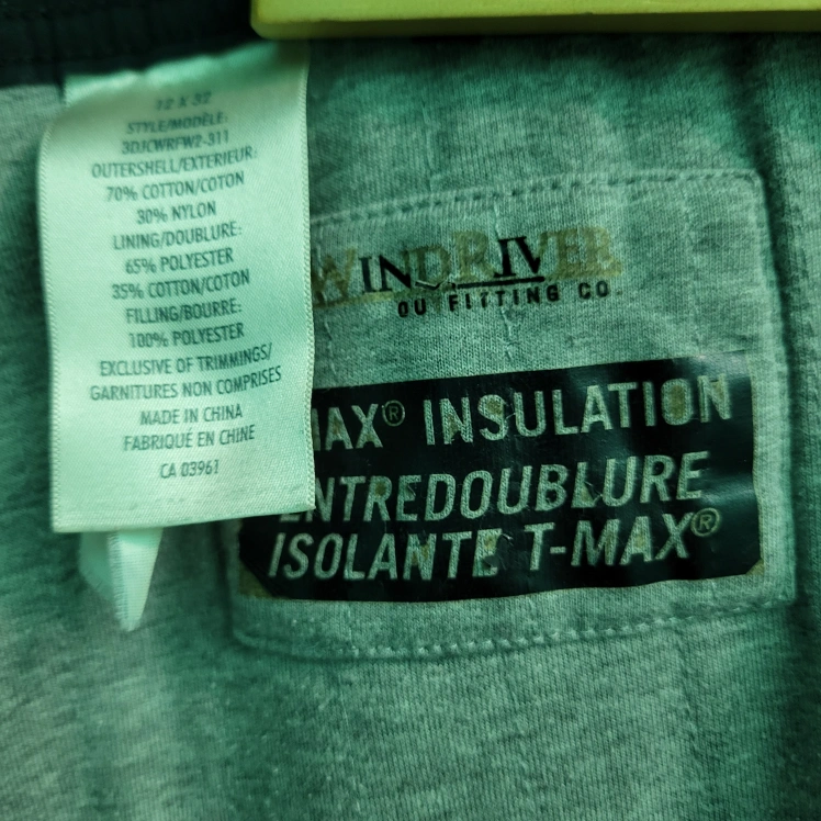 Wind River T-Max insulated pants in size 12. The outer shell is made of 70% cotton and 30% nylon, while the lining is 65% polyester and 35% cotton. The filling is 100% polyester.