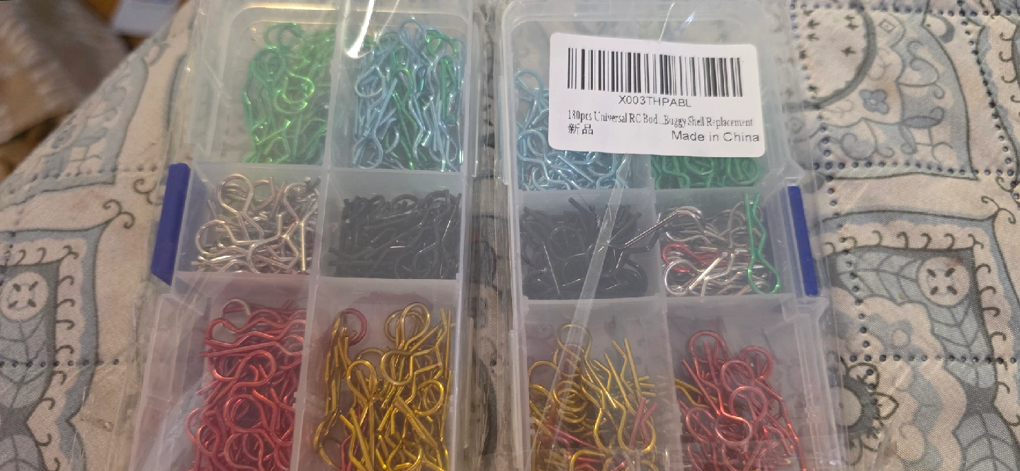 Selling a set of 180 universal RC body buggy shell replacements. The container includes a variety of colours like green, blue, silver, black, red and gold.