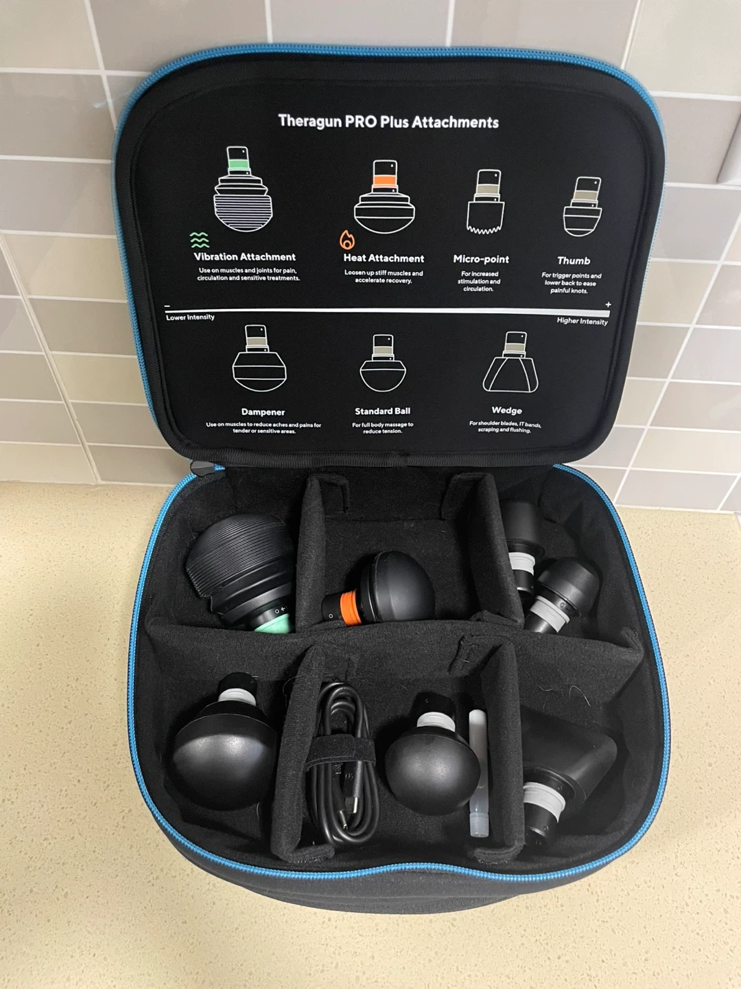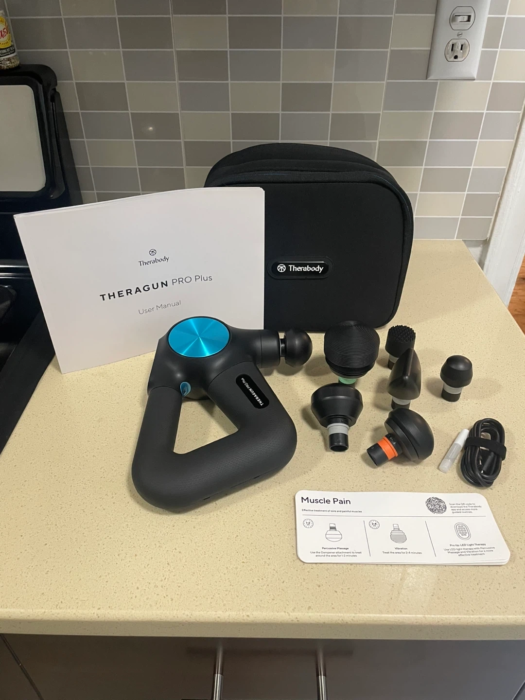 Selling a Therabody Theragun PRO Plus - all attachments included! Comes with charging wire, user manual, maintenance oil, and a carrying case. This device offers percussive, vibration, heat, and LED light therapy to help treat sore muscles and relieve tension. It's great for loosening up stiff muscles, improving circulation, and targeting trigger points.