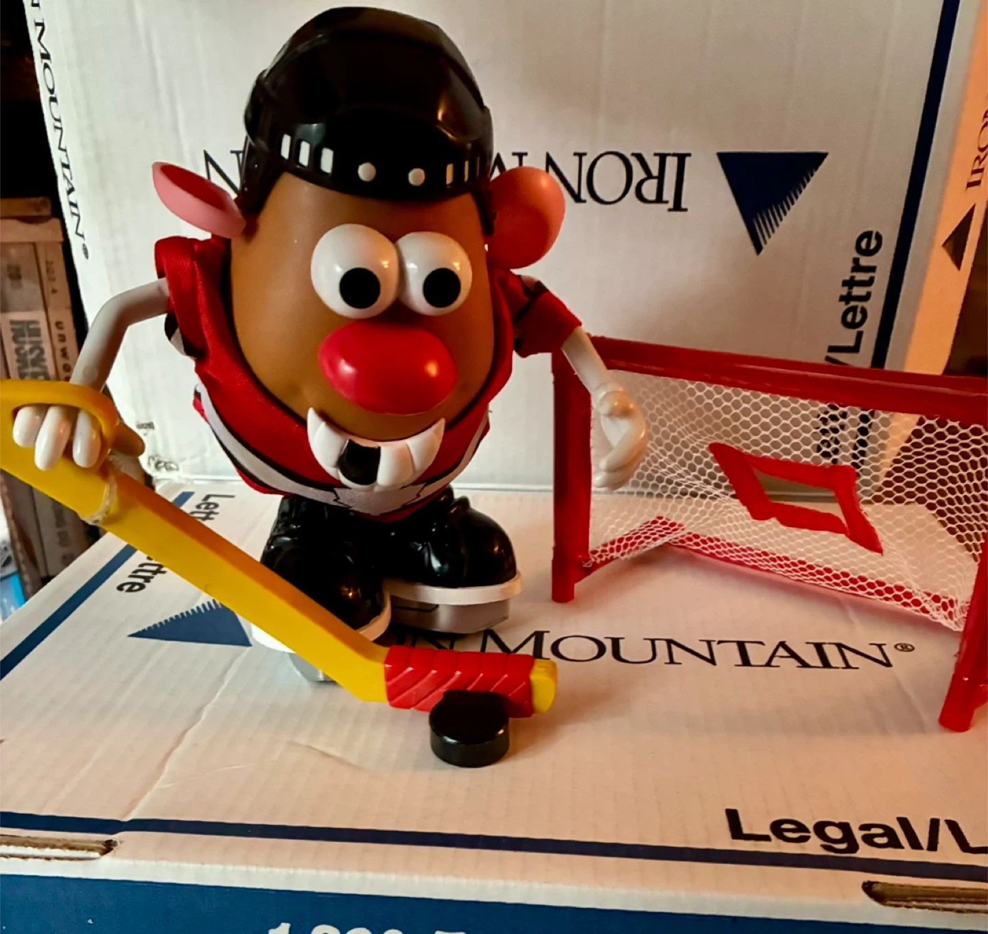 This is a Mr. Potato Head dressed as a hockey player. It comes with a hockey stick, puck and net for some fun games.