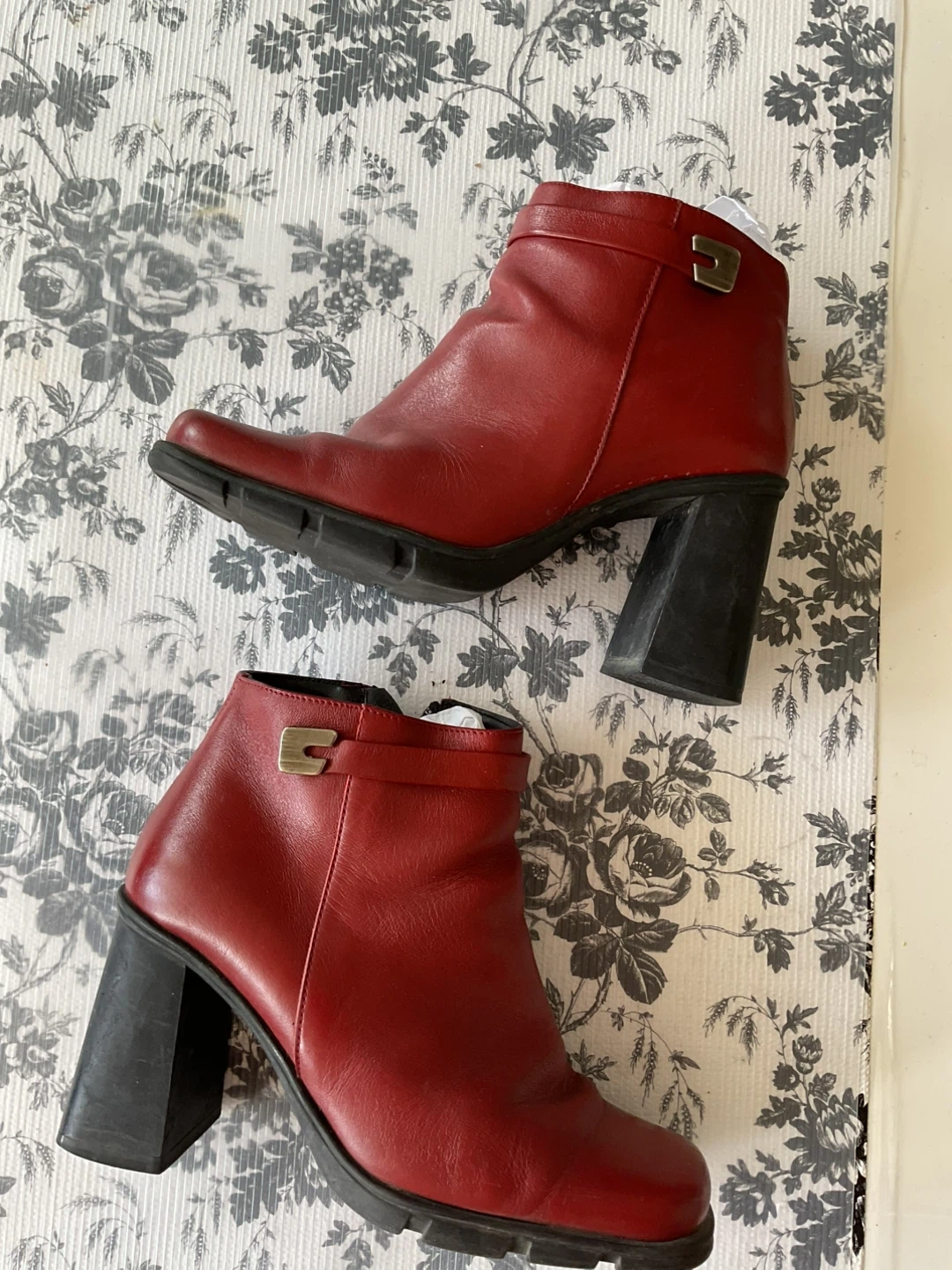 Selling a pair of red leather ankle boots. They are in good condition and have a unique style with a chunky heel. The size is 38, which is equivalent to a US size 8. Perfect for adding a pop of colour to your outfit!