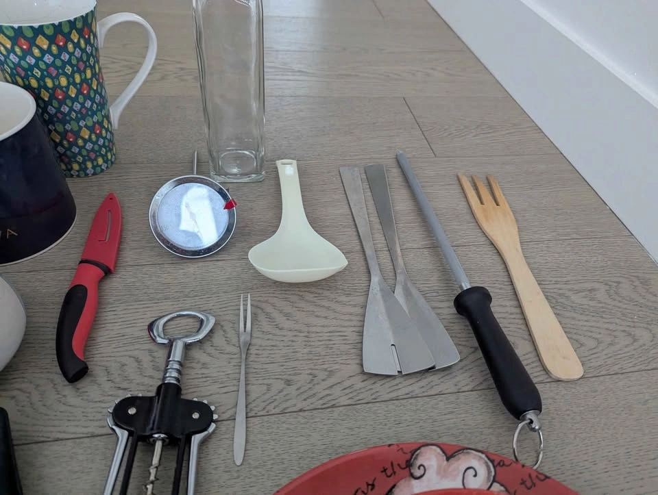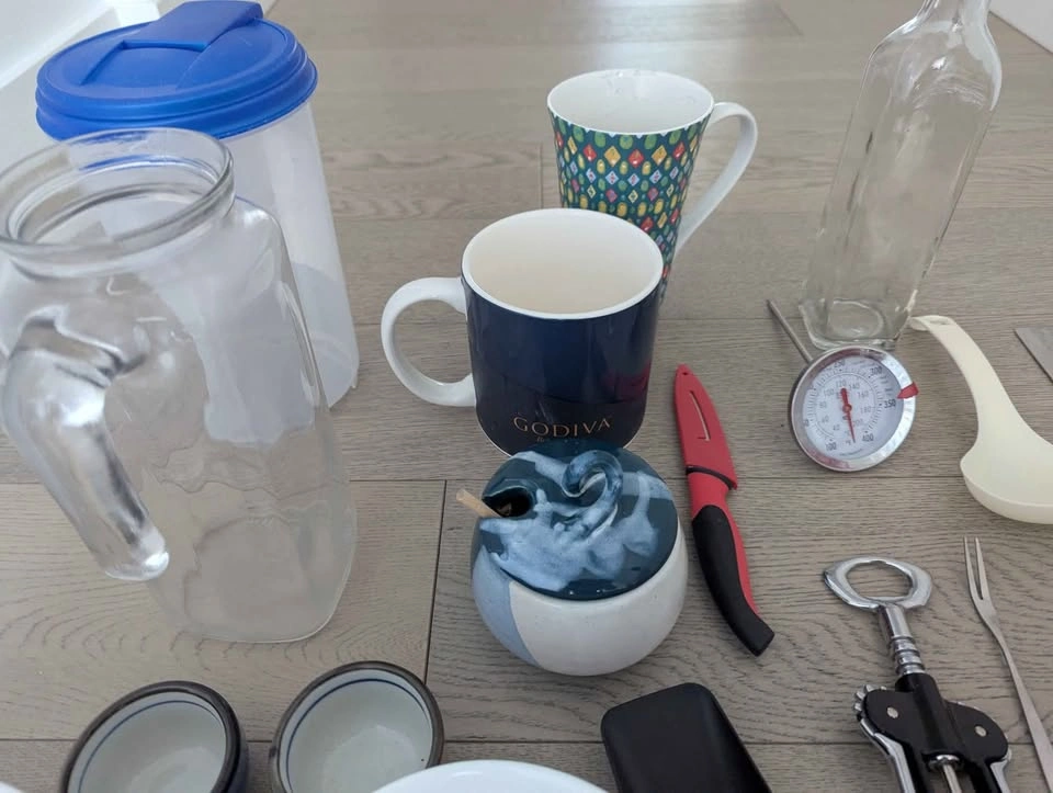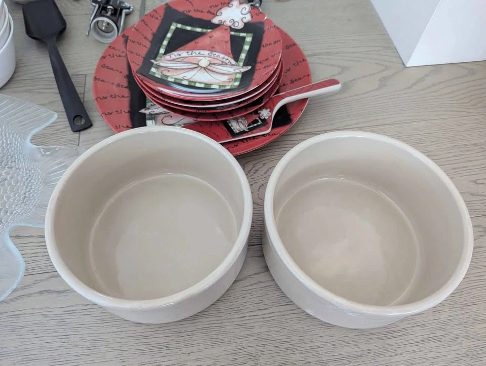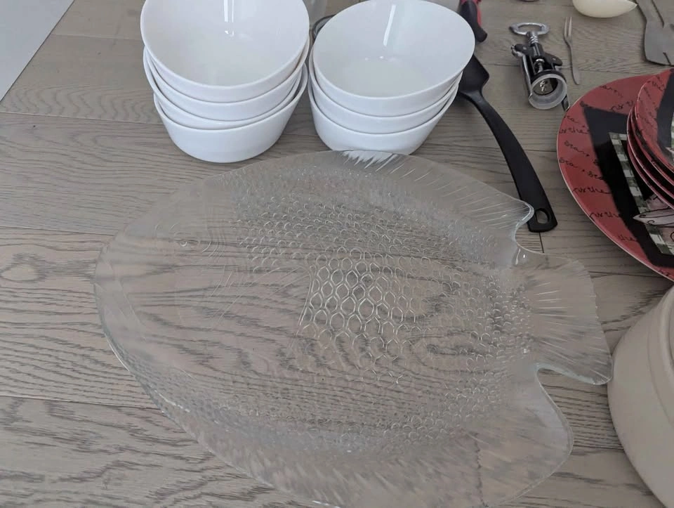 A variety of kitchen stuff including two large bowls, seven medium bowls, four medium Christmas plates, one large Christmas plate, one large glass fish plate, two salad servers, two coffee mugs, a glass pitcher, a plastic pitcher, a glass bottle, a meat thermometer, a small knife, a corkscrew, a knife steel, two small tea cups, a pickle fork, and a few other random things. Take the whole lot for $15. Pickup near 49th and Cambie.