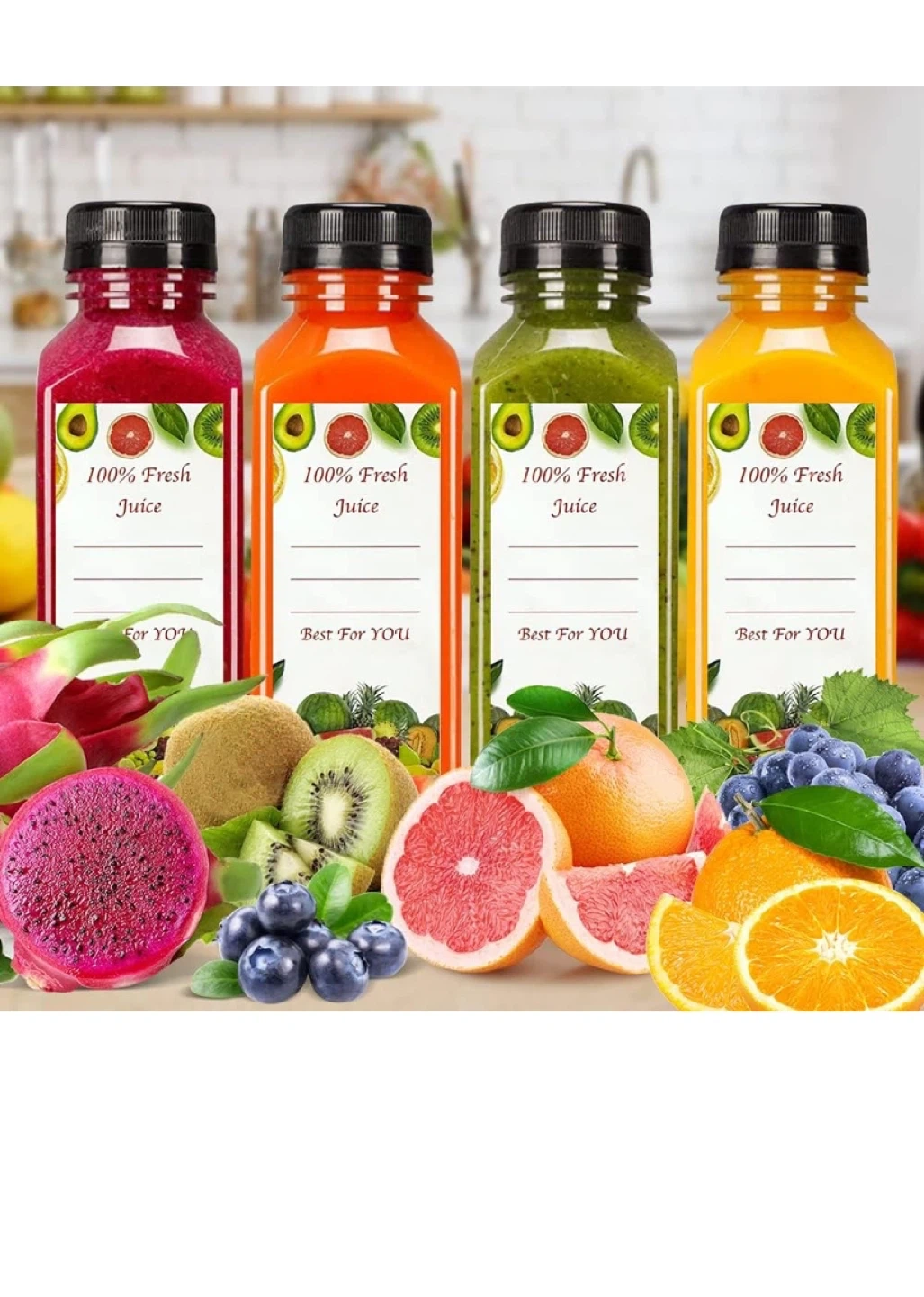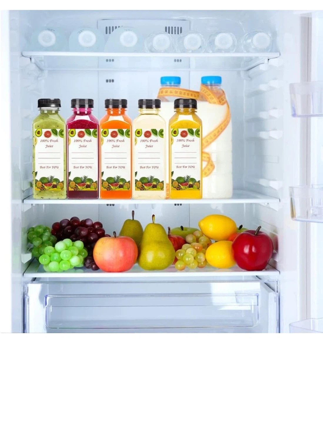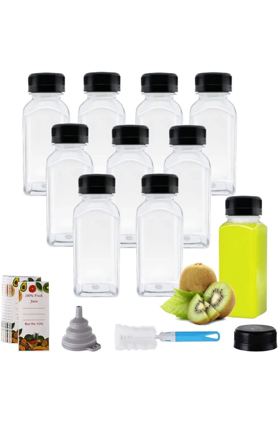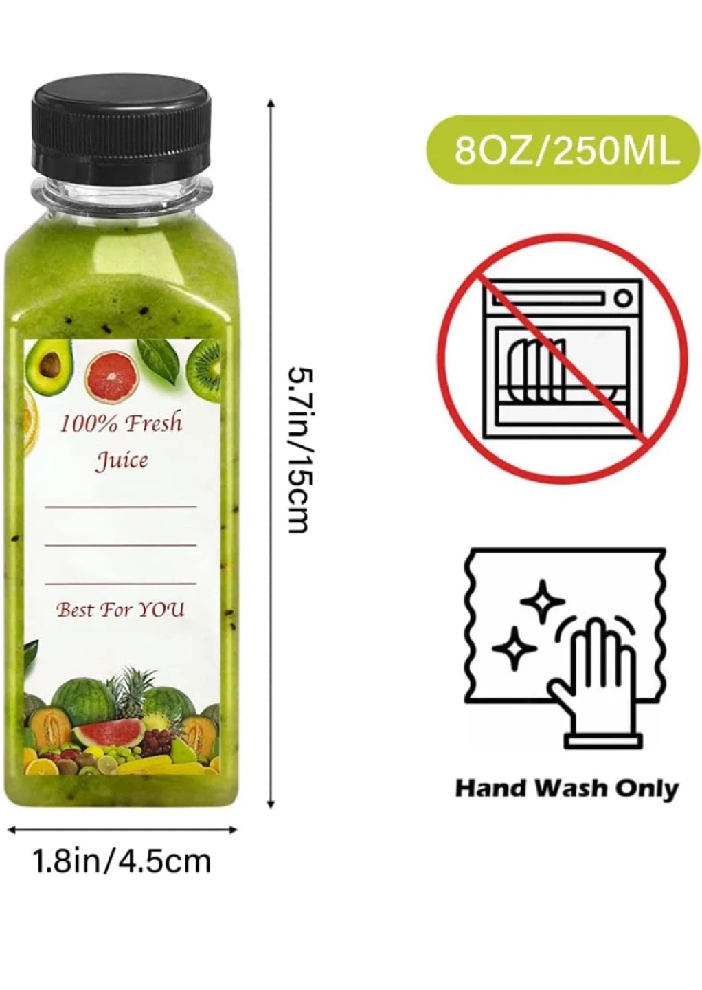 9I have some brand new juice bottles for sale! They're 8oz/250mL each and come with lids. They're perfect for making your own fresh juice. The bottles are 5.7in/15cm tall and 1.8in/4.5cm wide. Hand wash only