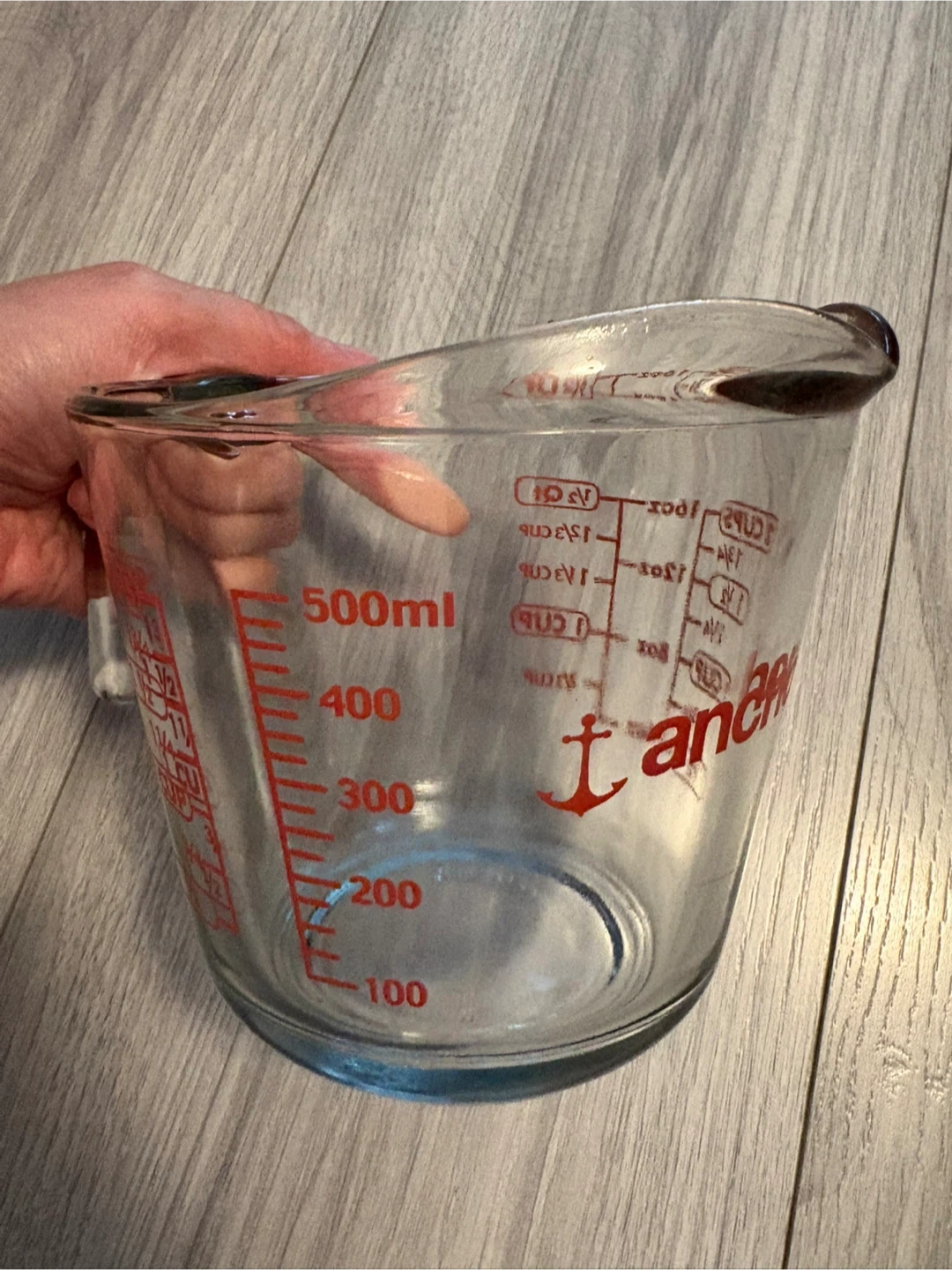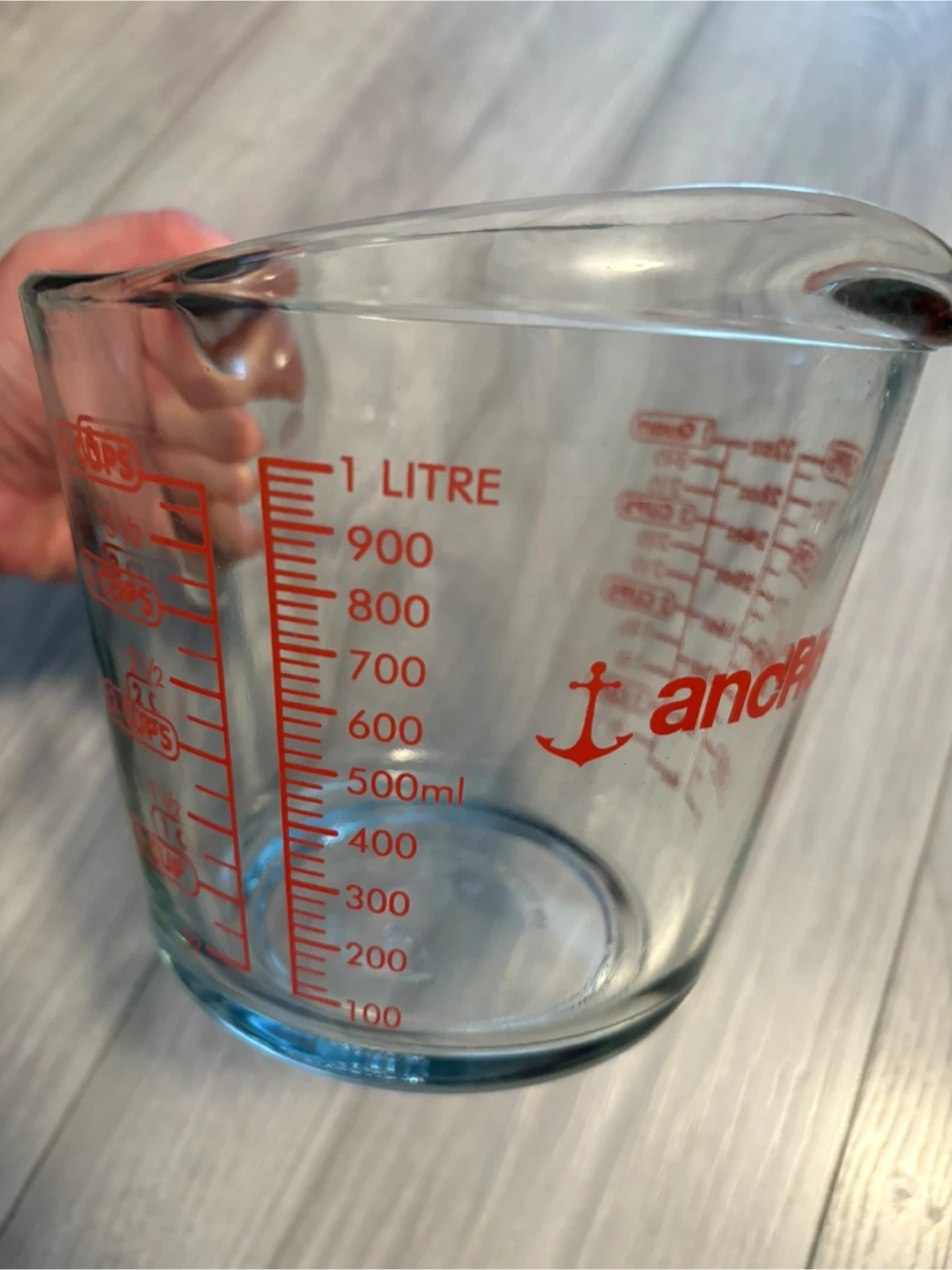 Selling an Anchor Hocking measuring cups! It's glass measuring cup with red markings for both litres and cups. Perfect for all your baking and cooking needs