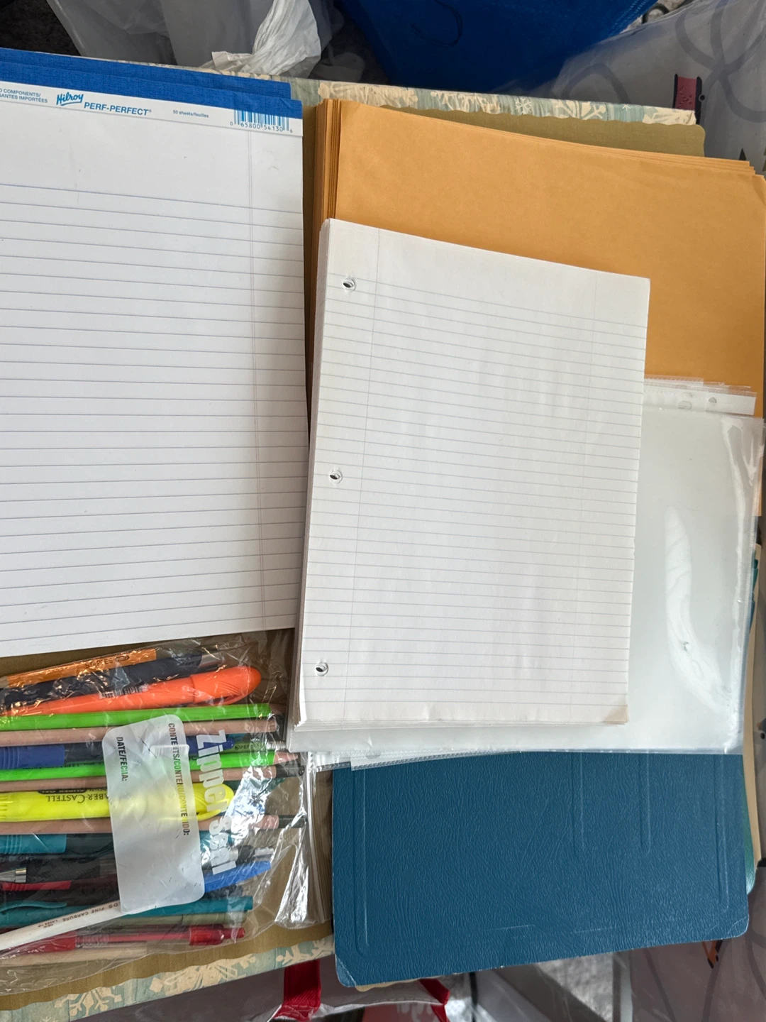 Selling a stationery bundle that includes a Hilroy Perf-Perfect notepad and a variety of pens and highlighters, including Faber-Castell. Everything you need for school or office work!