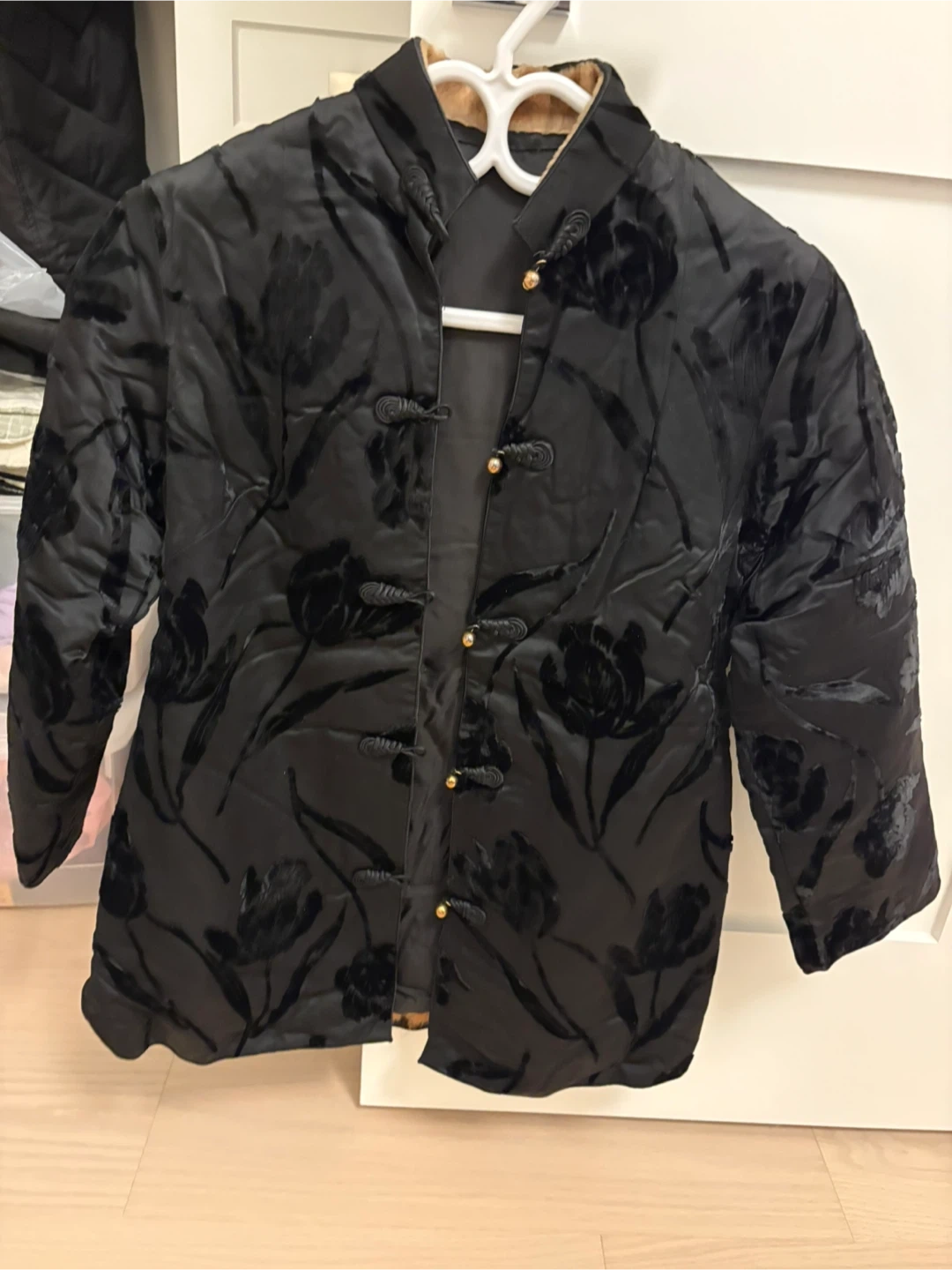 I'm selling a lovely black velvet jacket with a floral pattern. It has a unique design with toggle closures and a mandarin collar. Perfect for adding a touch of elegance to any outfit!