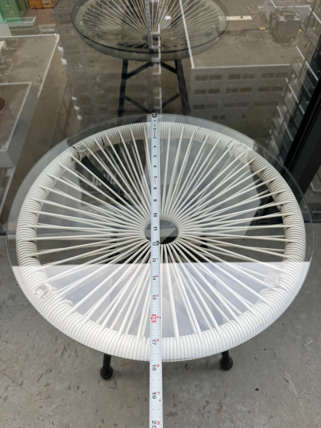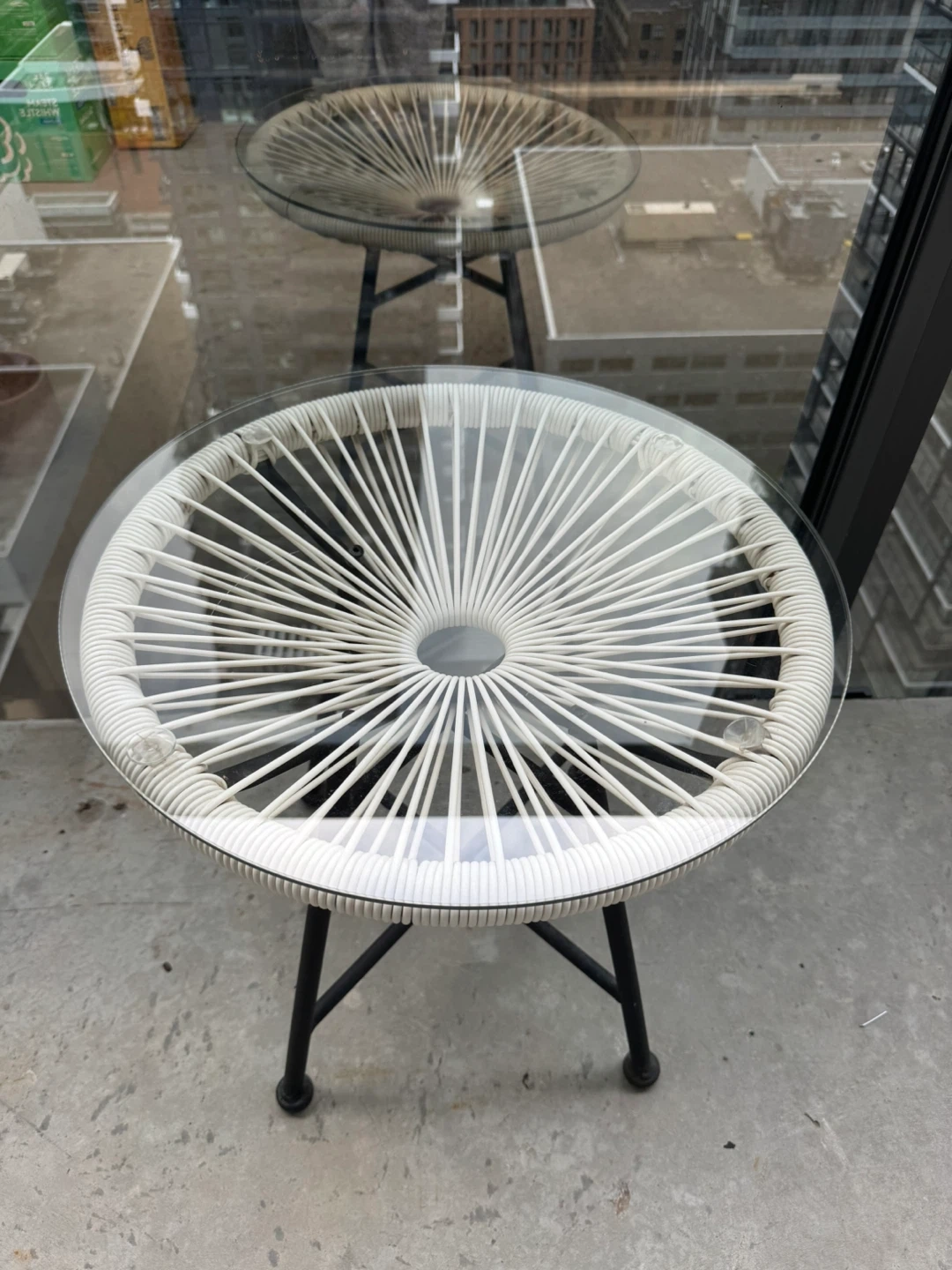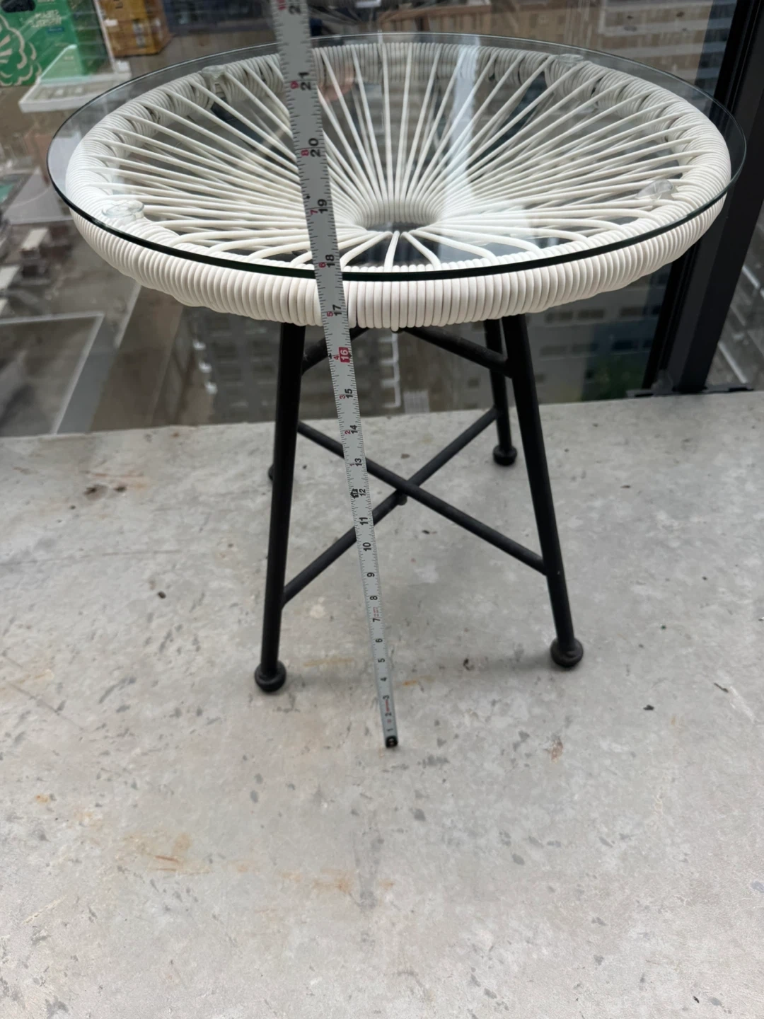 277Selling a cute round side table perfect for a patio or small space! The table has a glass top and a woven white design around the edge. It sits on a black metal base. It's about 19 inches in diameter and 21 inches tall, making it a great size for next to a chair or as a small coffee table