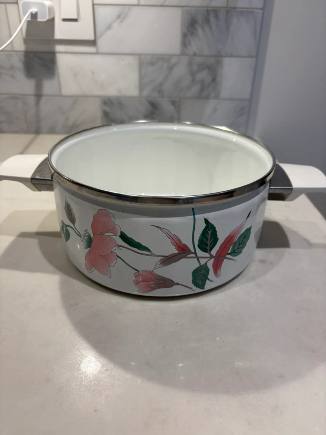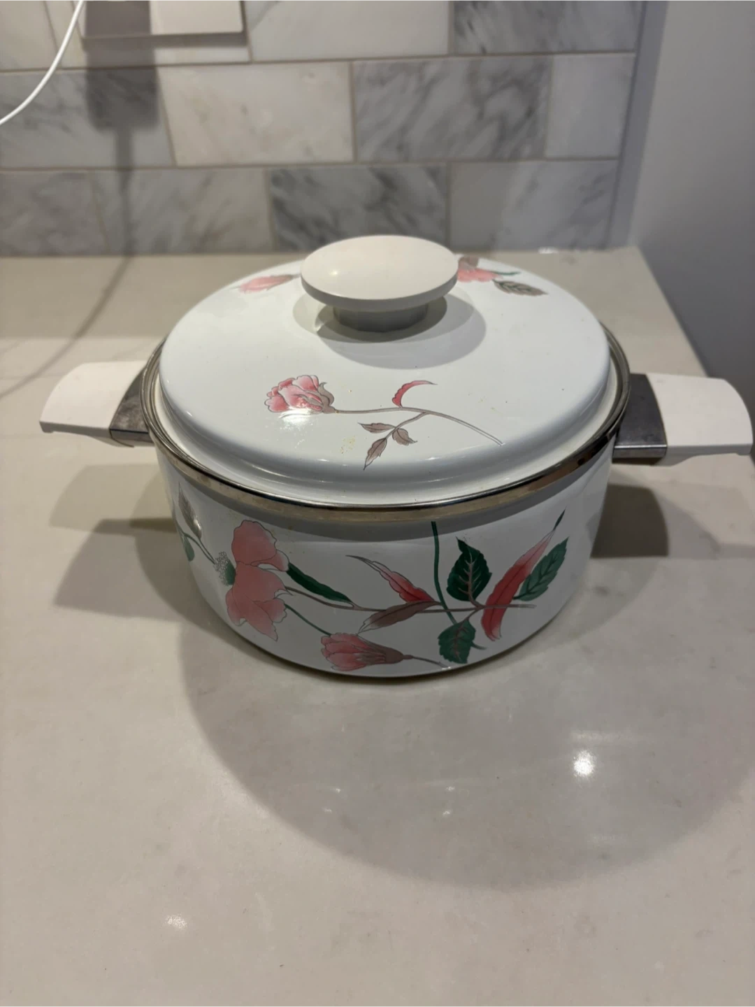 Selling a lovely vintage stock pot. It features a beautiful floral design in pink and green. The pot comes with a matching lid and is perfect for cooking soups, stews, or sauces. It’s in great condition and ready for a new home!