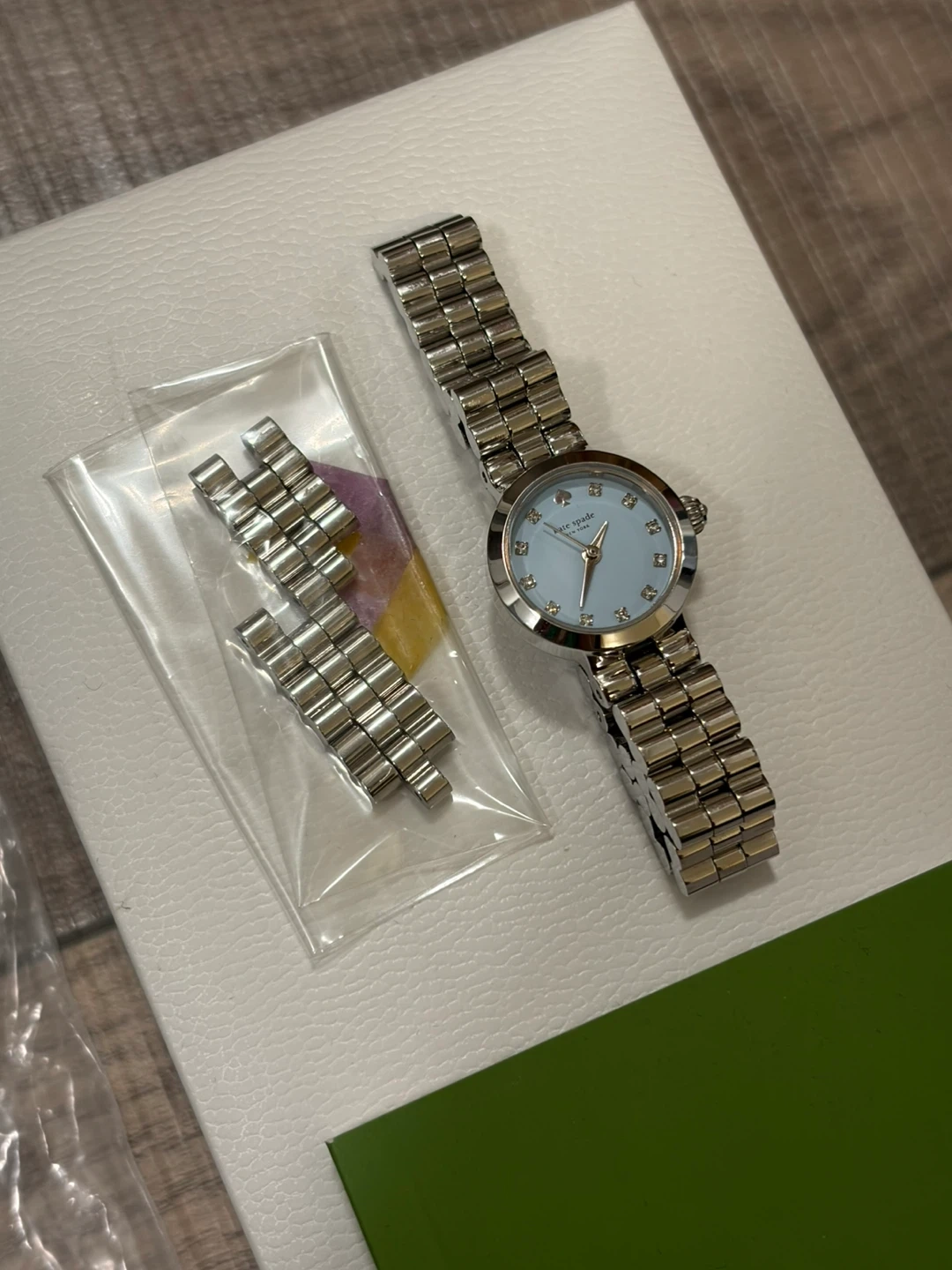 Kate Spade women's watch with a light blue dial and silver-tone metal band.