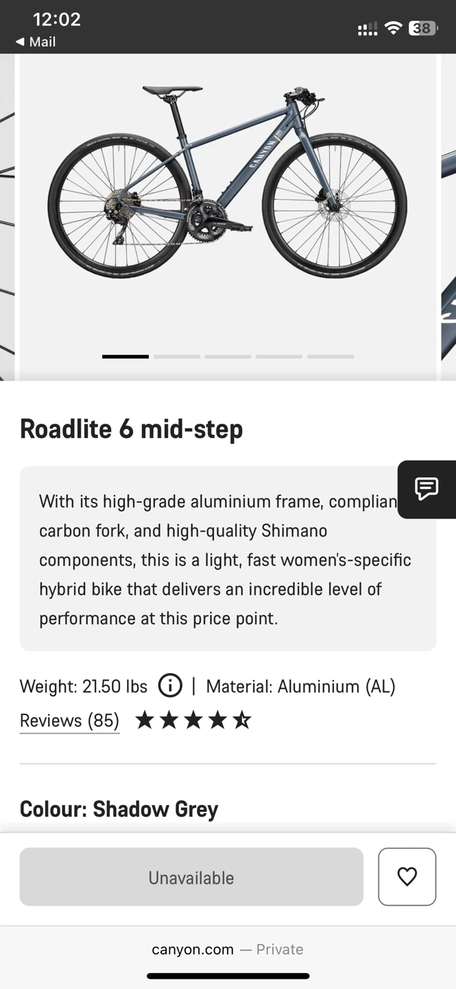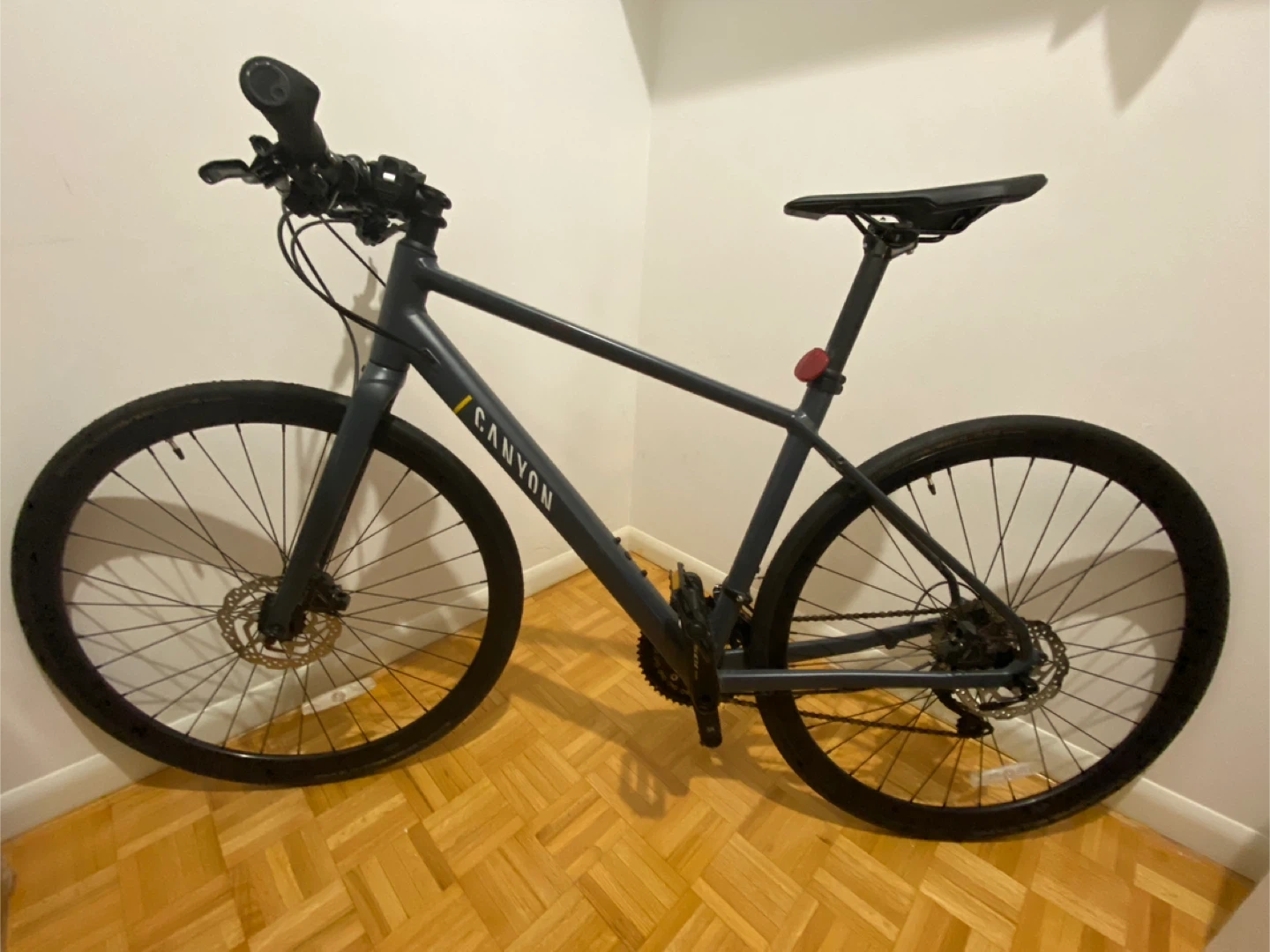 Selling a Canyon Roadlite 6 mid-step hybrid bike in Shadow Grey. Purchased in 2021 and serviced frequently - in excellent condition! It features a high-grade aluminum frame and a compliant carbon fork. The bike also comes with high-quality Shimano components. It's a light and fast women's-specific hybrid bike designed for performance. Weight is 21.50 lbs and the frame is Canyon Roadlite WMN AL. Bonus gift - premium Smith helmet and pump.