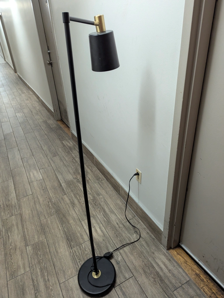 Here's a sleek floor lamp with a black finish and gold accents! It's perfect for adding a touch of modern style to any room. The lamp has a sturdy base and a simple on/off foot switch for easy use. Light bulb included!