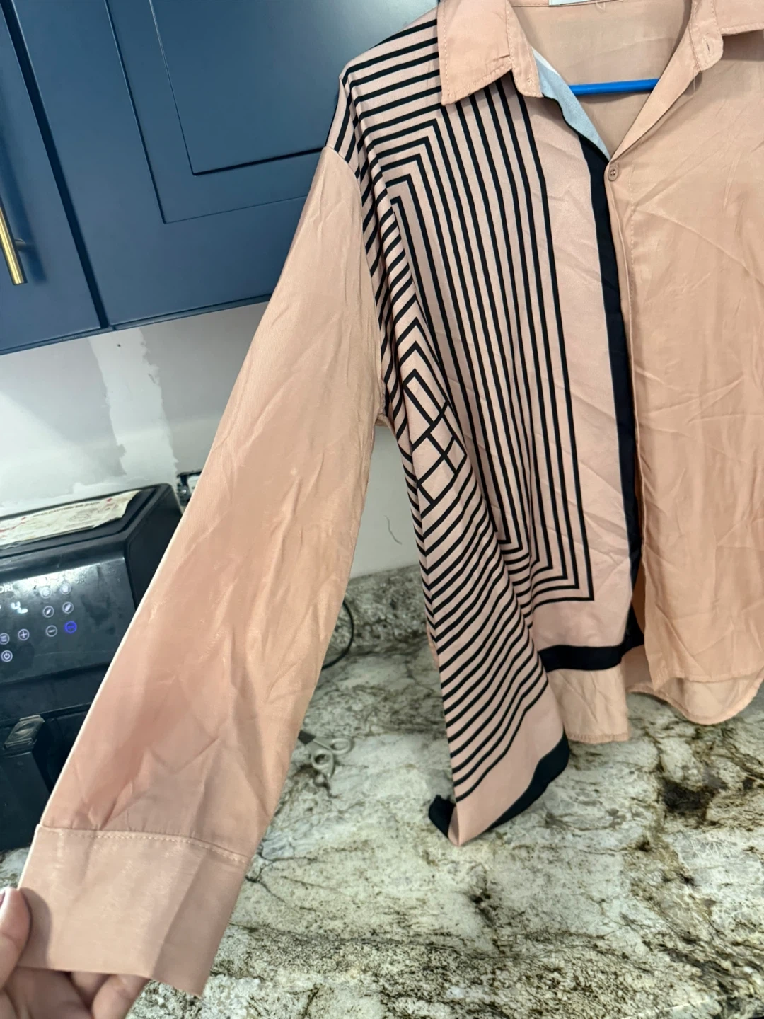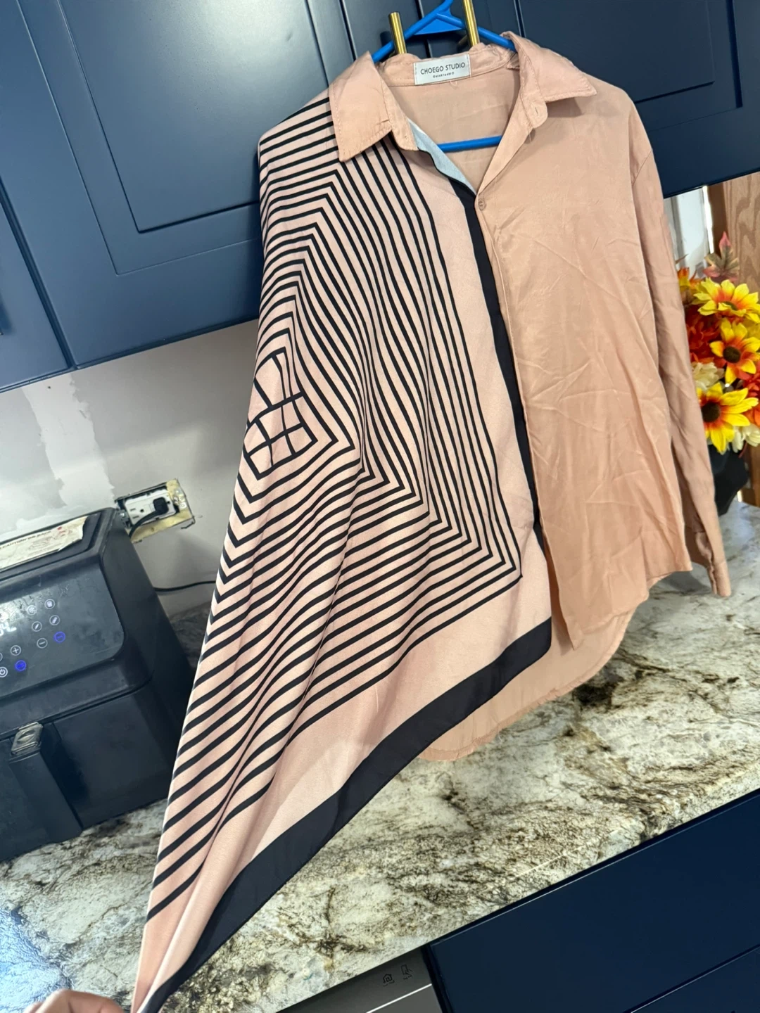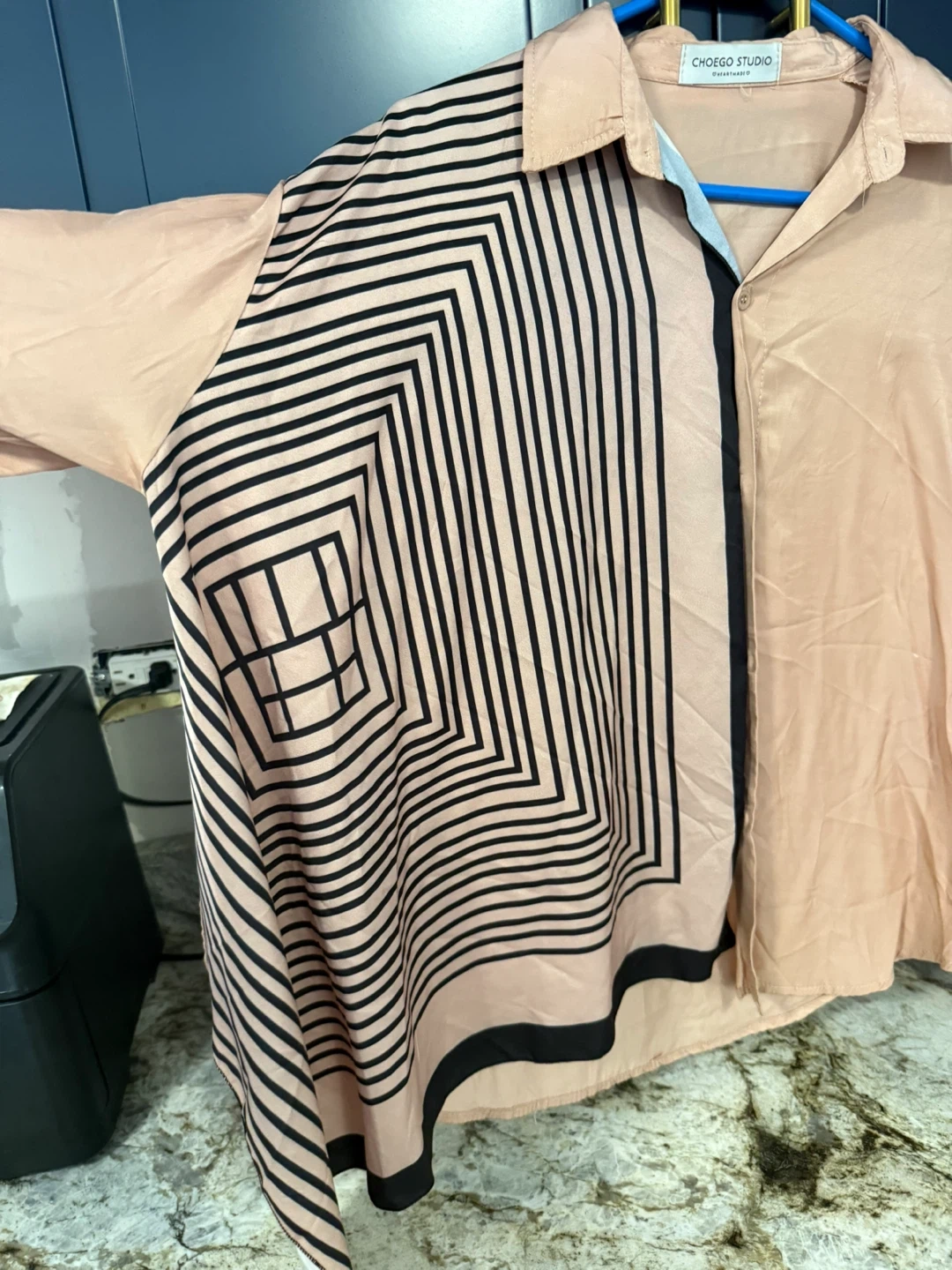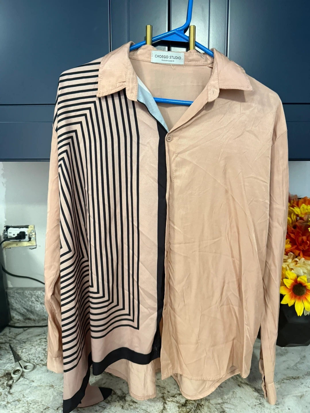 This is a CHOEGO STUDIO shirt with a unique pattern. The shirt is a light peach color with a black and white geometric design on one side. It's in good condition and ready for a new home!