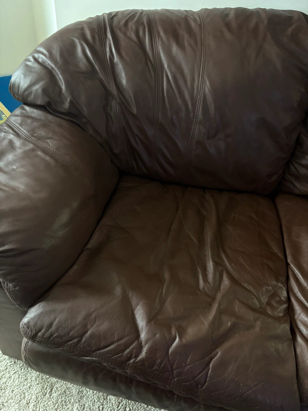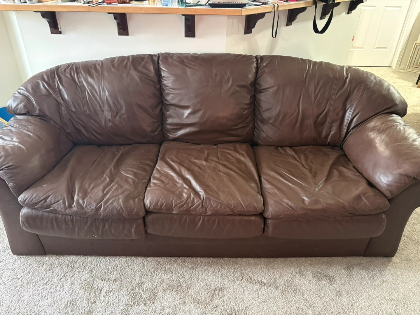 Selling a comfy brown leather sofa. It shows some signs of wear, but still has lots of life left! It would be perfect for a living room or den.