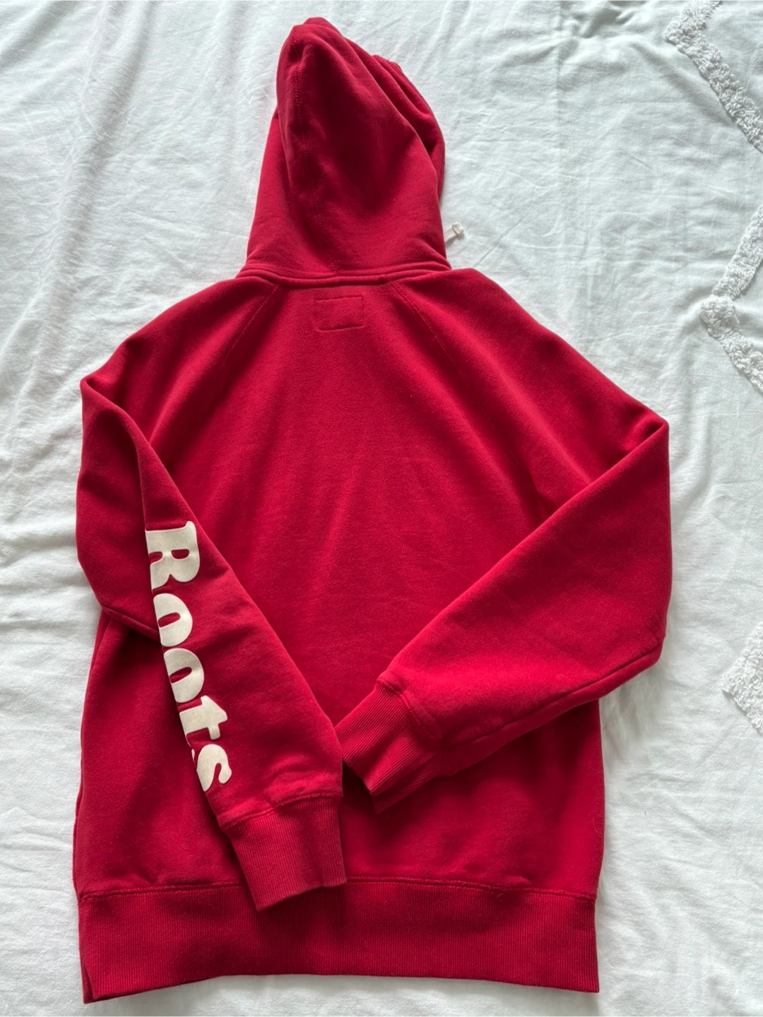 Selling a Roots hoodie in red, size small. It has the classic Roots logo on the front and the brand name down the sleeve. It's in great condition and super comfy!