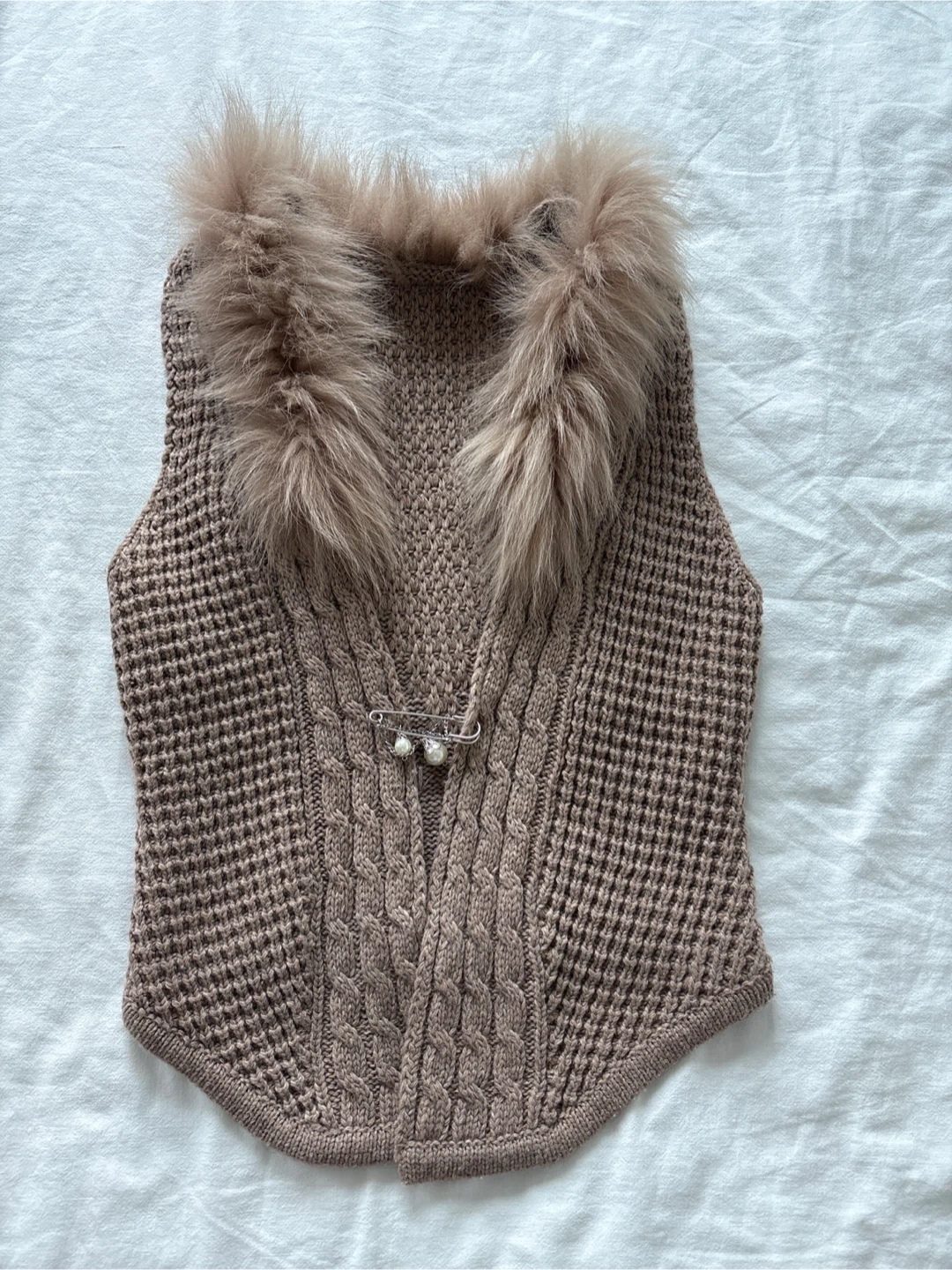 This is a lovely brown knit vest! It features a soft fur collar, adding a touch of warmth and style. Perfect for layering during cooler weather