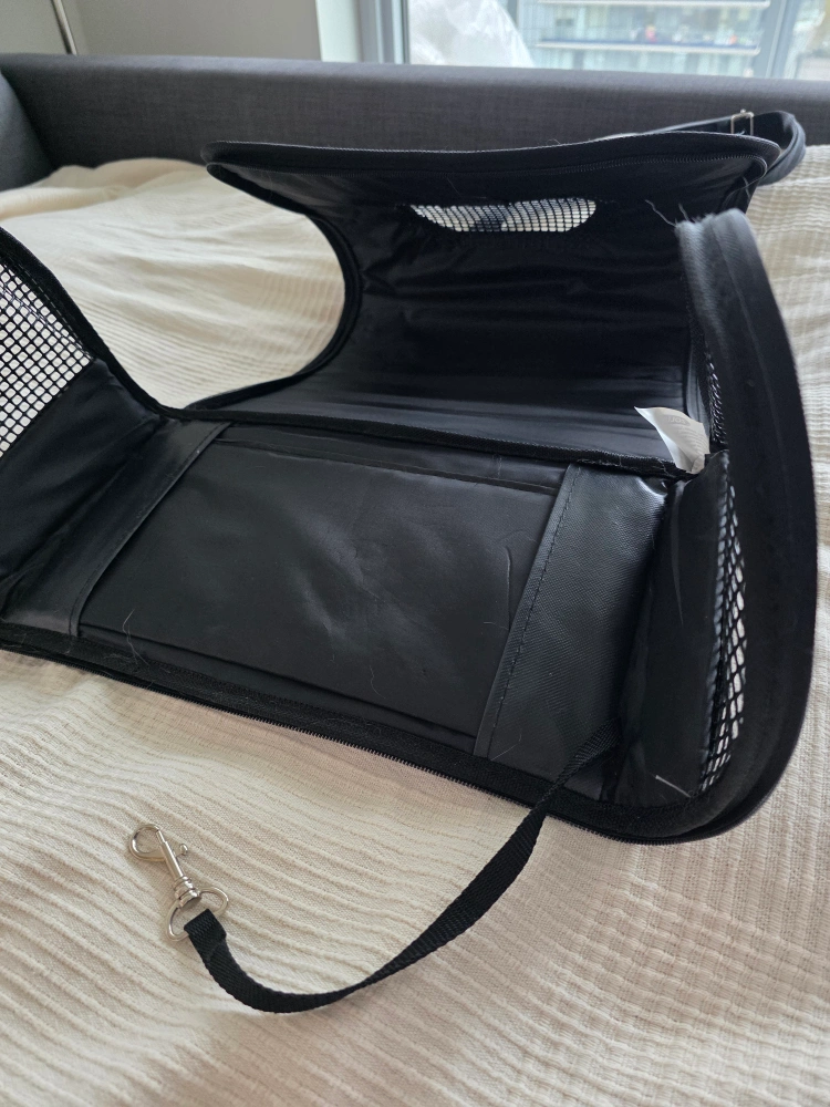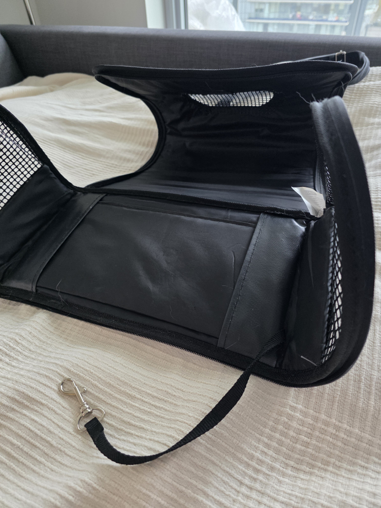 It’s in great shape and perfect for cats or small dogs. The carrier comes with both a handle and a shoulder strap, making it easy to carry your furry friend around town.