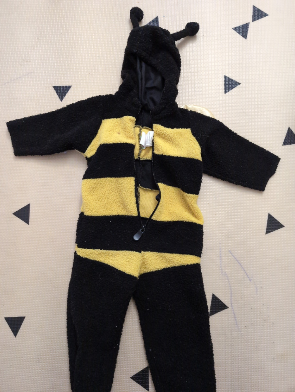 Cute bee costume for kids! It features black and yellow stripes and wings on the back. Perfect for Halloween or dress-up!