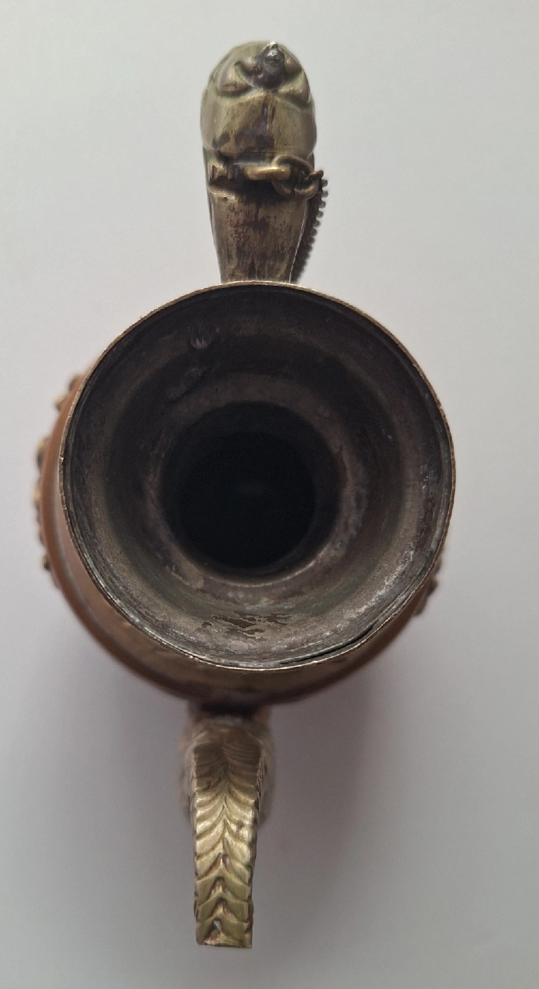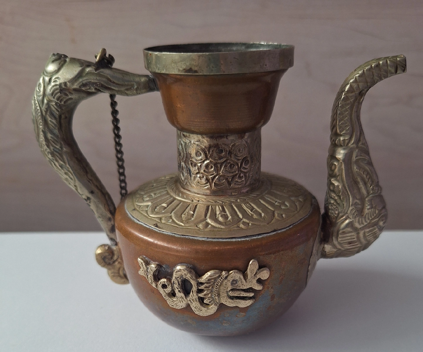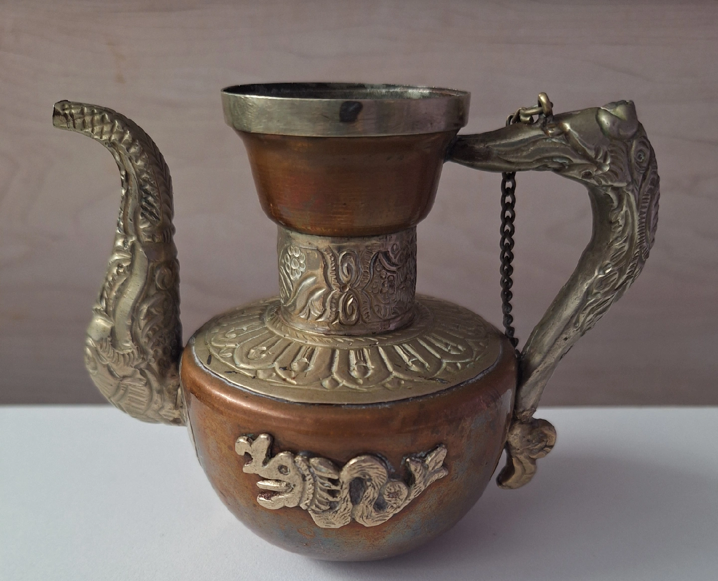 unique vintage copper and brass Tibetan teapot. It has an ornate design with dragon details on the handle and body. 4.5 inches tall
