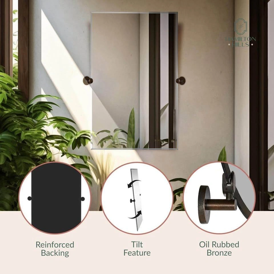 Hamilton Hills 20x30 inch Frameless Pivot Mirror for Bathrooms with Oil Rubbed Bronze Rounded Wall Brackets | Rectangular Tilting & Farmhouse Wall-Mounted Vanity | Hangs Horizontally and Vertically