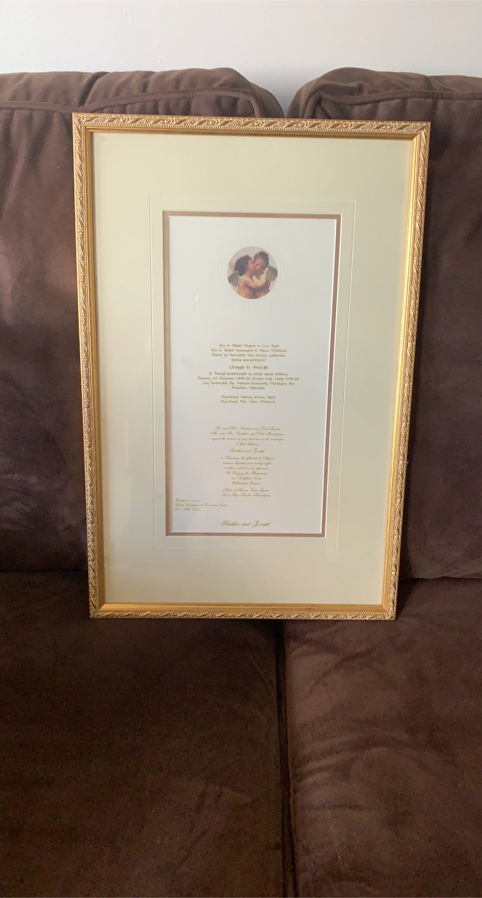 Framed wedding invitation for Heather and Joseph. It appears to be from a wedding ceremony held on Saturday, the fifteenth of August nineteen hundred and ninety-eight. The invitation is in a gold frame.
