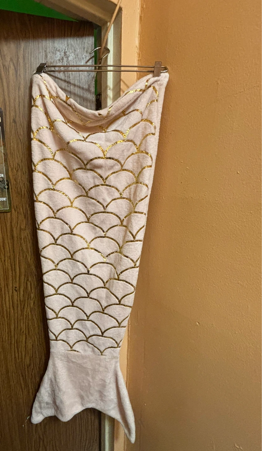 Selling a cute mermaid tail blanket! It's a light pink color with gold scale details. Perfect for cozying up on the couch!