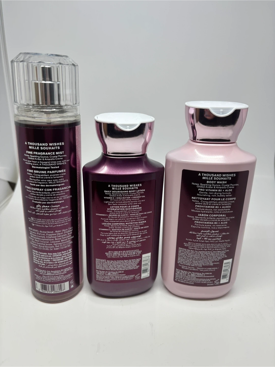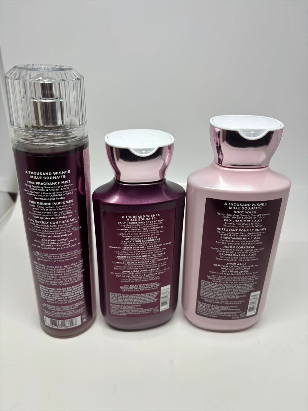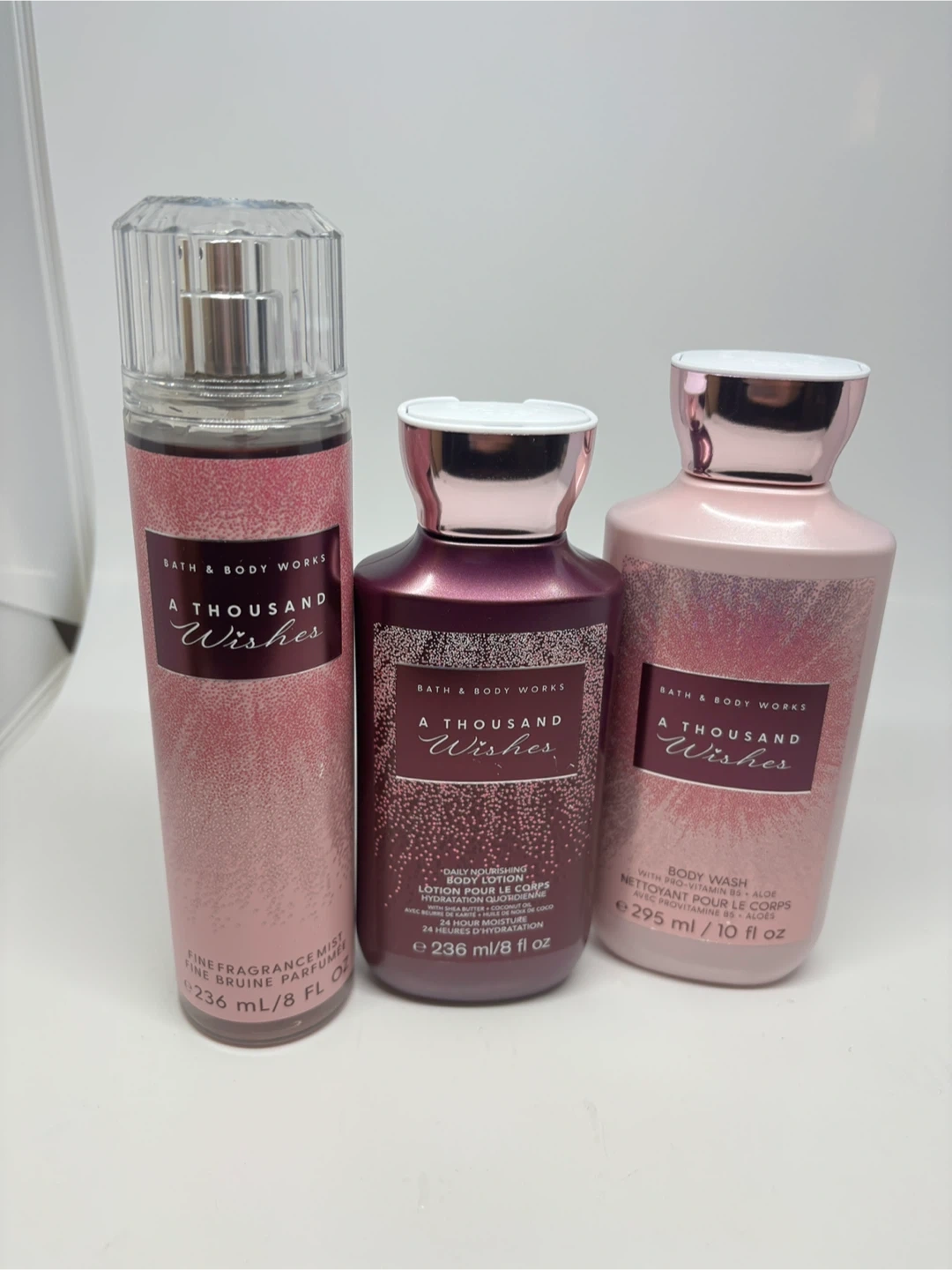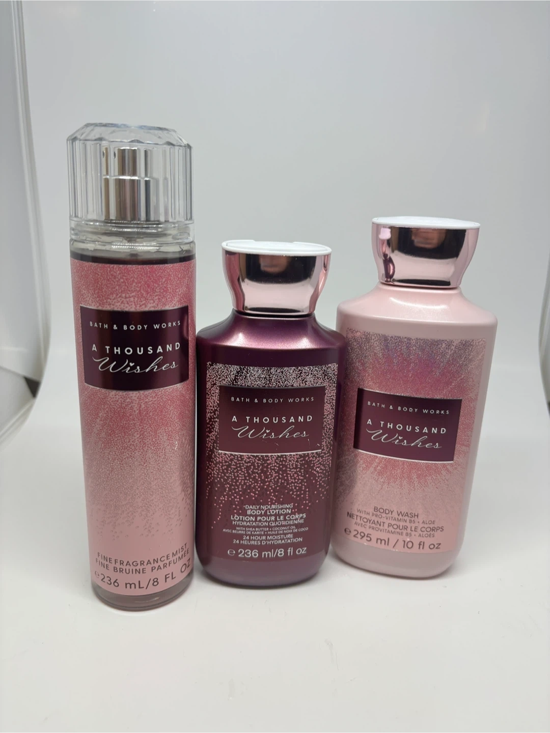 Selling a Bath & Body Works 'A Thousand Wishes' set! Includes a fine fragrance mist (236 mL/8 fl oz), a daily nourishing body lotion (236 mL/8 fl oz), and a body wash (295 mL/10 fl oz)