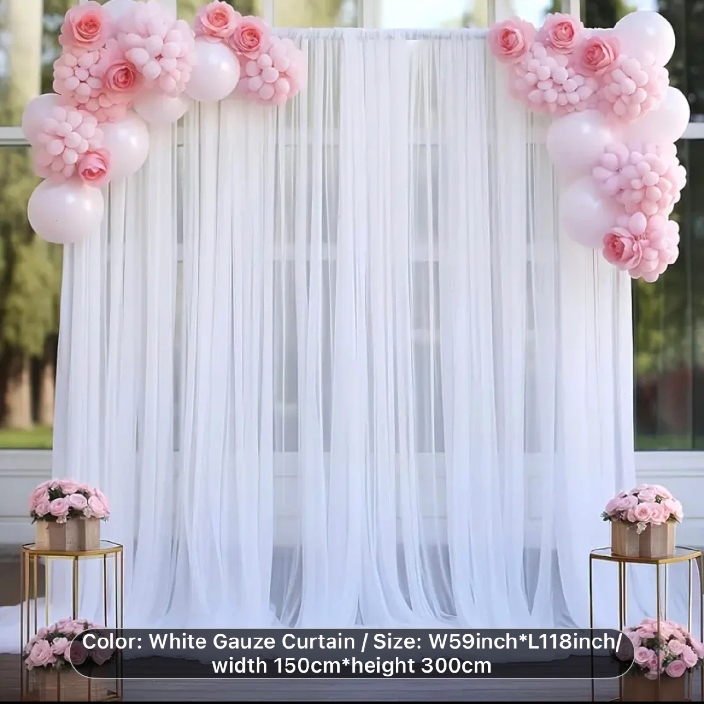 Selling a white gauze curtain, perfect for weddings or events. It measures 59 inches wide and 118 inches in height. Also included are 30 pieces of white flower bundles, each measuring 30cm/11.81 inches. These can be used to decorate the curtain or as standalone floral arrangements