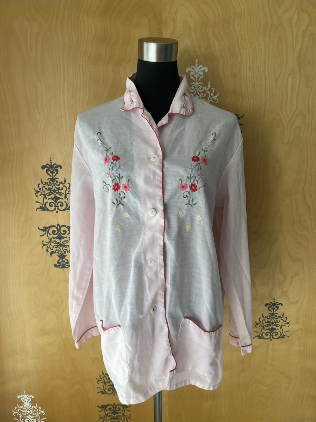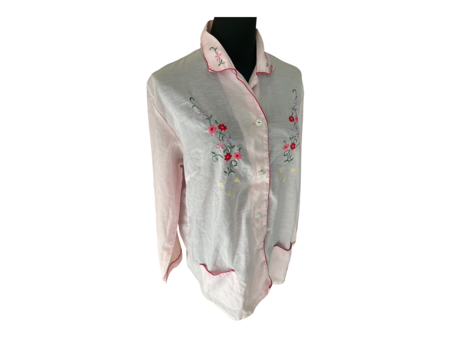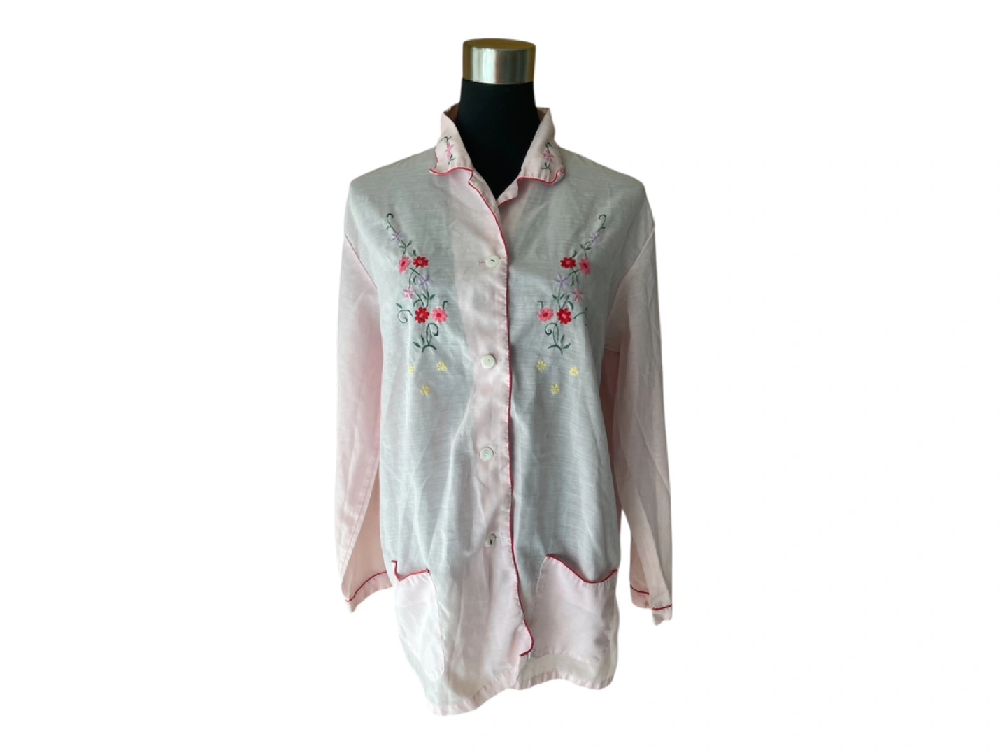 Vintage 90s Button Up Collared Blouse Pink Hand Embrodered Flowers Pockets Cotton Blend S/M