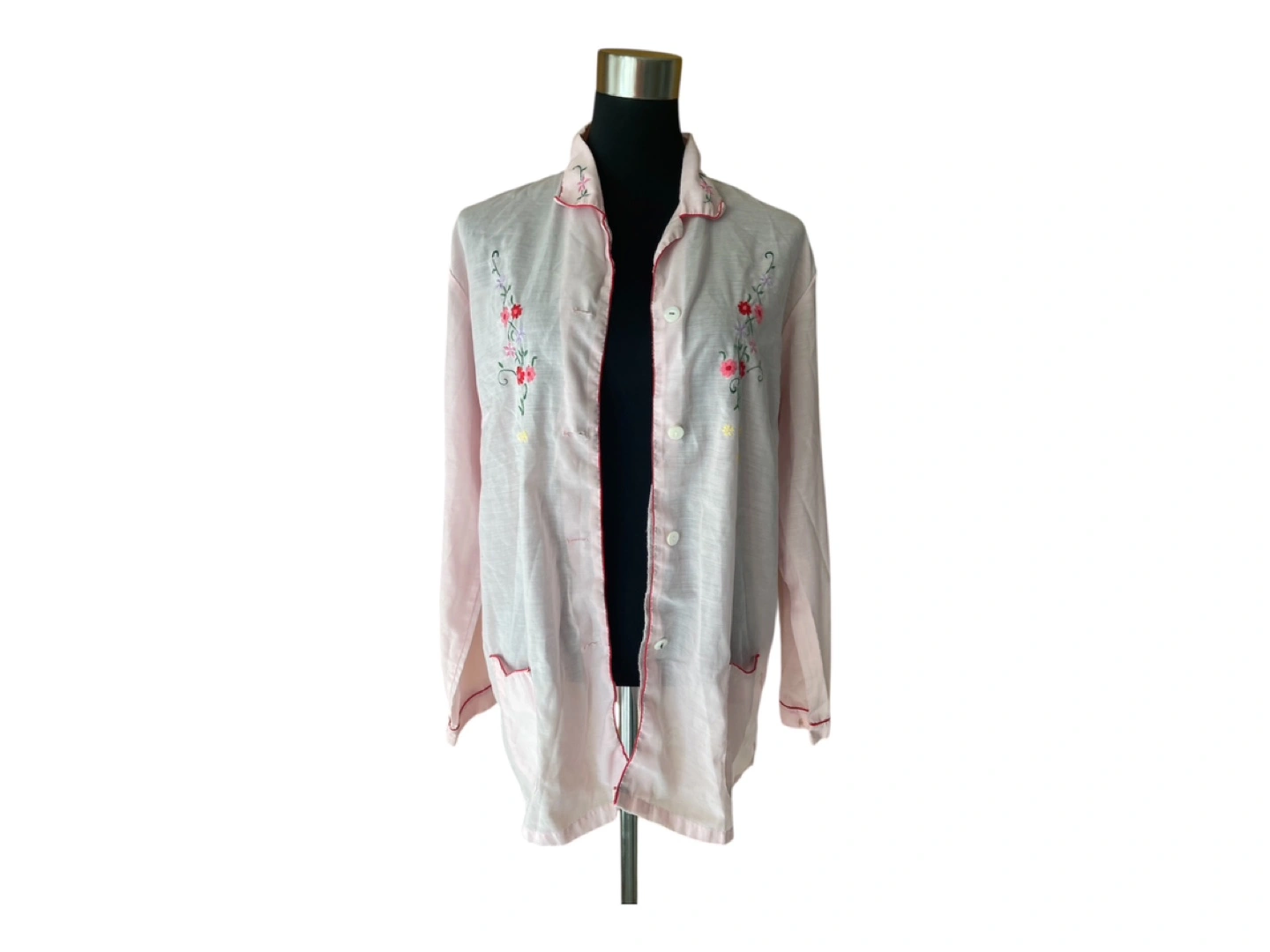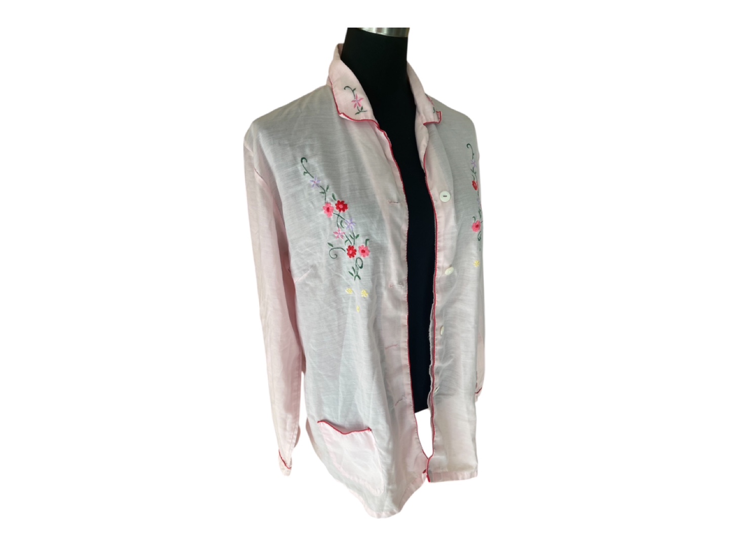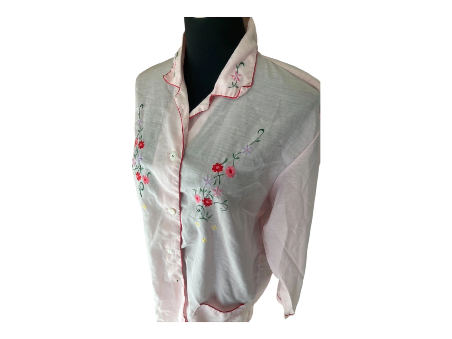 Vintage 90s Button Up Collared Blouse Pink Hand Embrodered Flowers Pockets Cotton Blend S/M