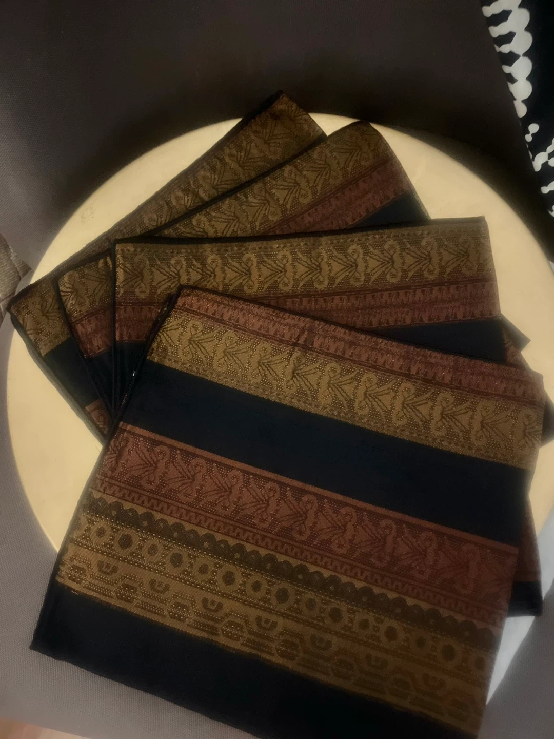Selling brand new in package cloth napkins. They feature a striped design with a decorative border. Perfect for adding a touch of elegance to your dining table