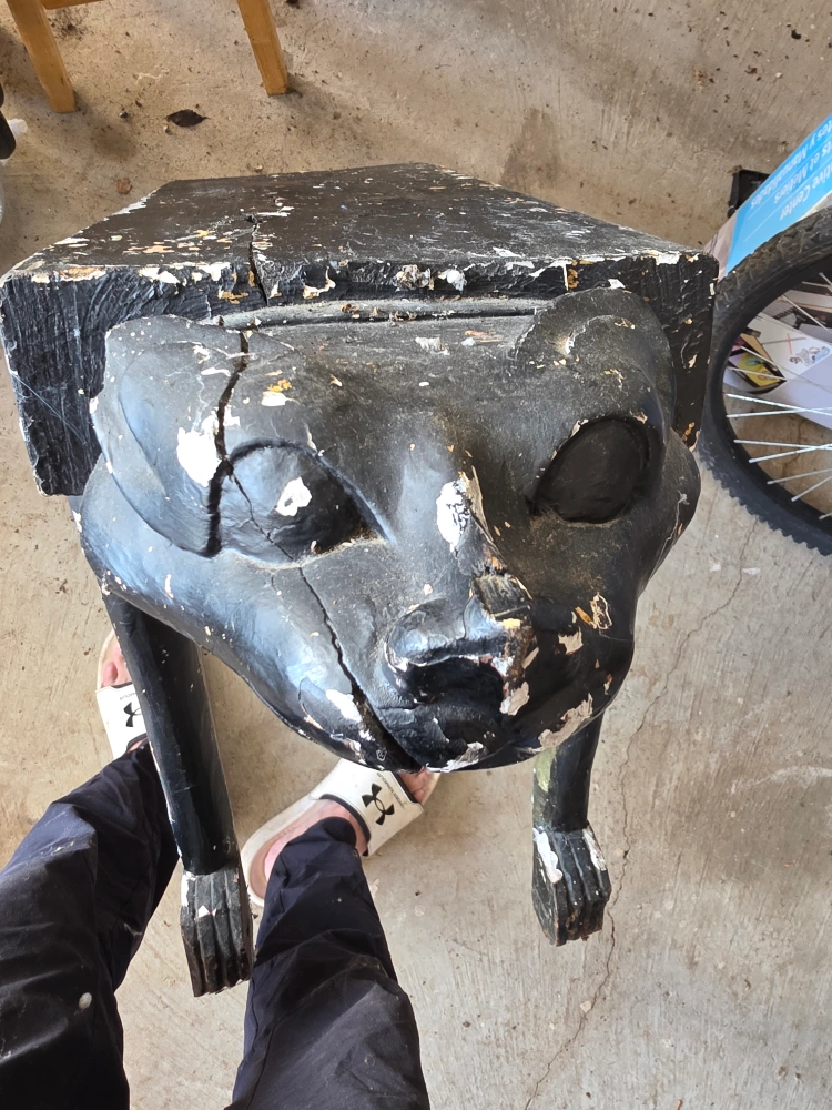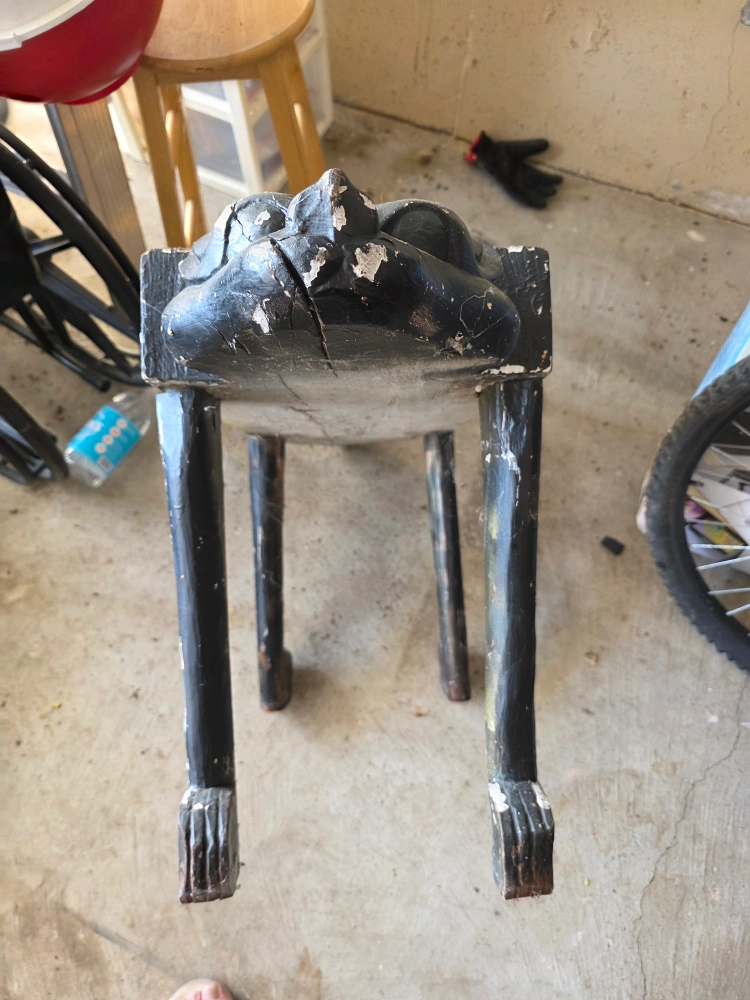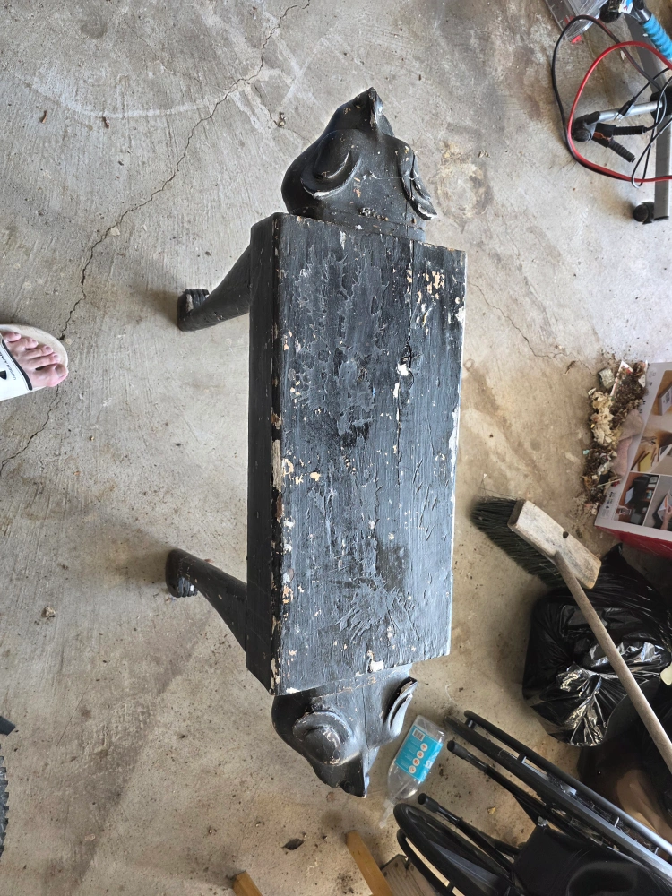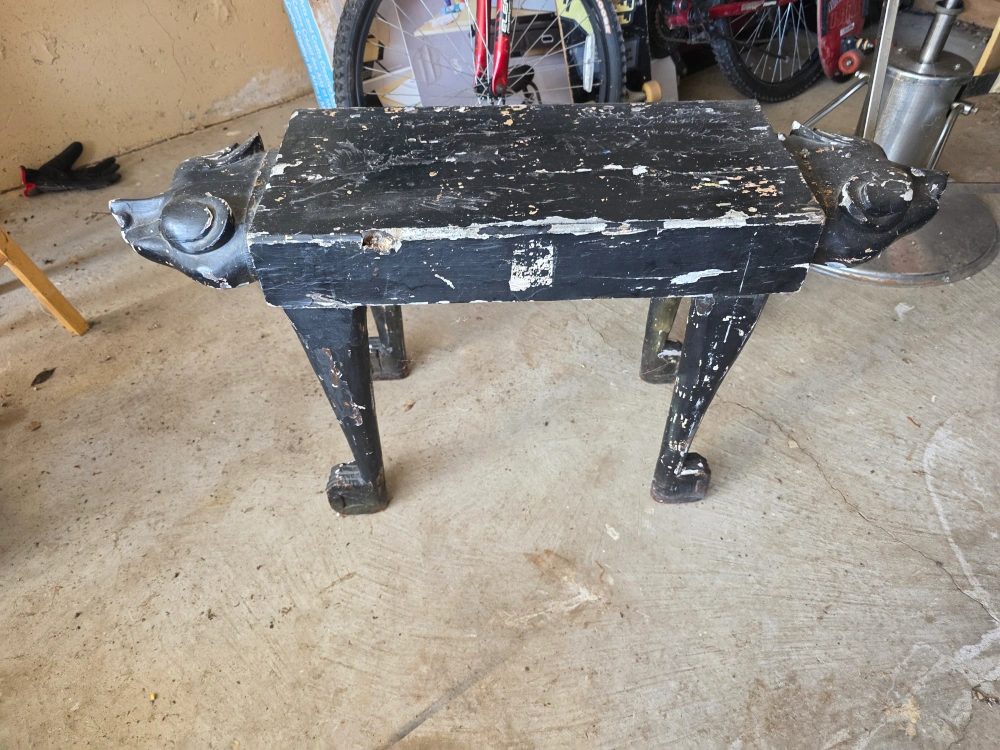 Selling a unique vintage accent table or stool. It's a black, four-legged piece with lion head carvings on either end. It has some wear and tear, as you can see in the photos, giving it a rustic, antique look. Perfect as a decorative piece or a small stool