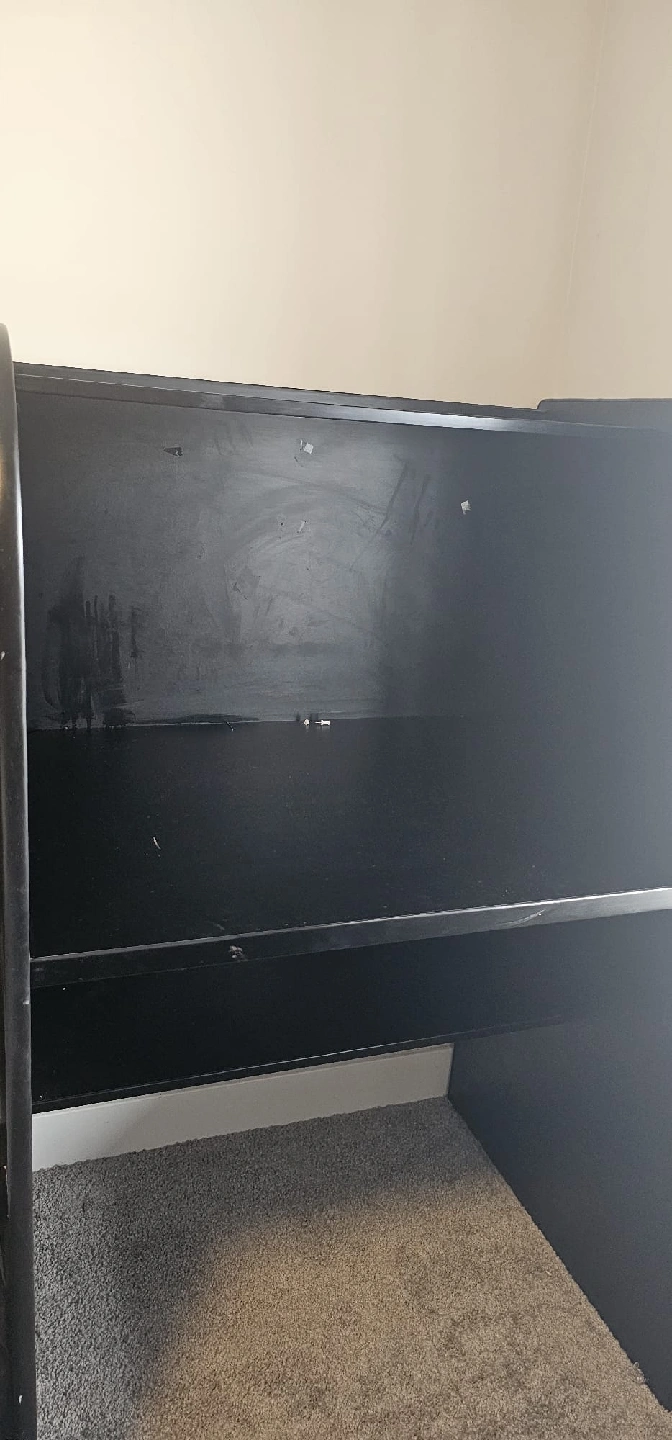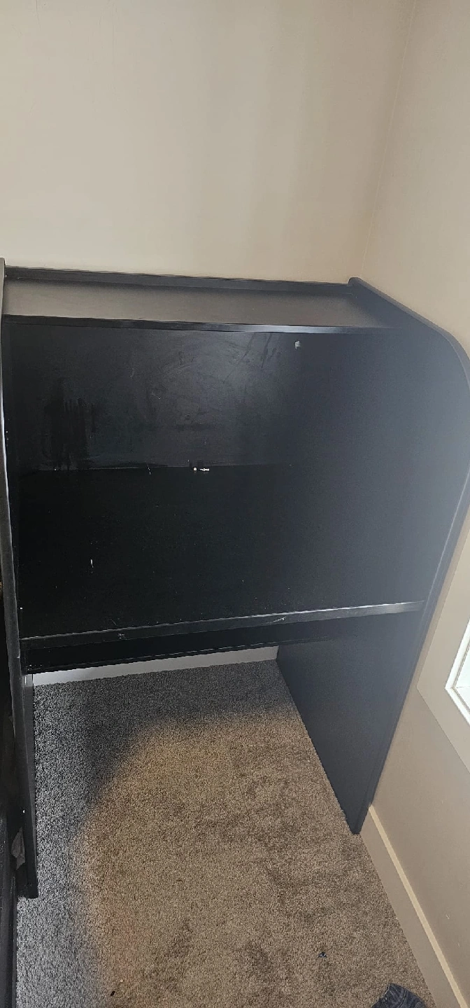 10Selling a black wood desk that comes with built-in shelves. It's in good condition and perfect for a home office or study space. The desk offers ample storage and a sleek design, making it a practical addition to any room