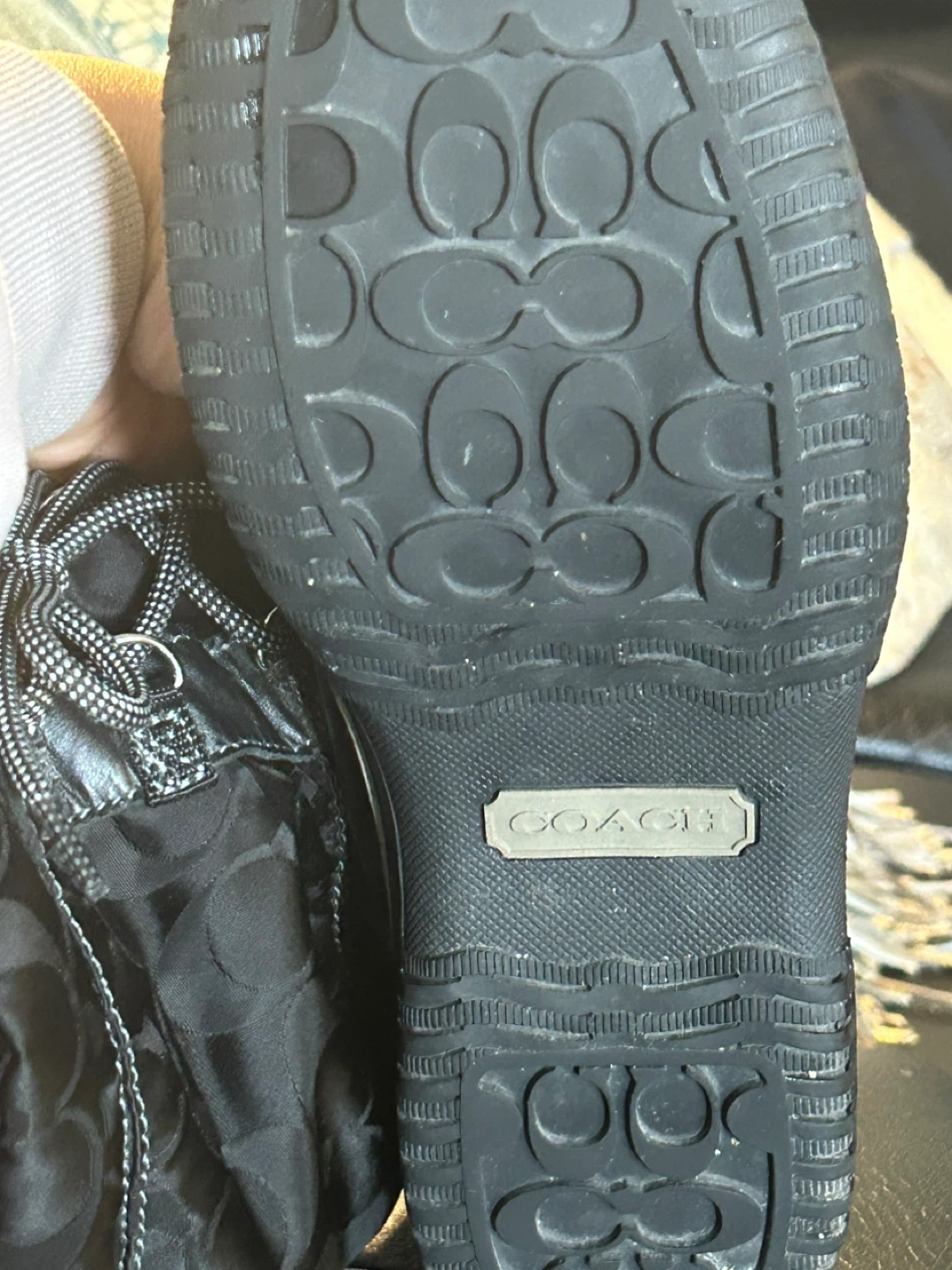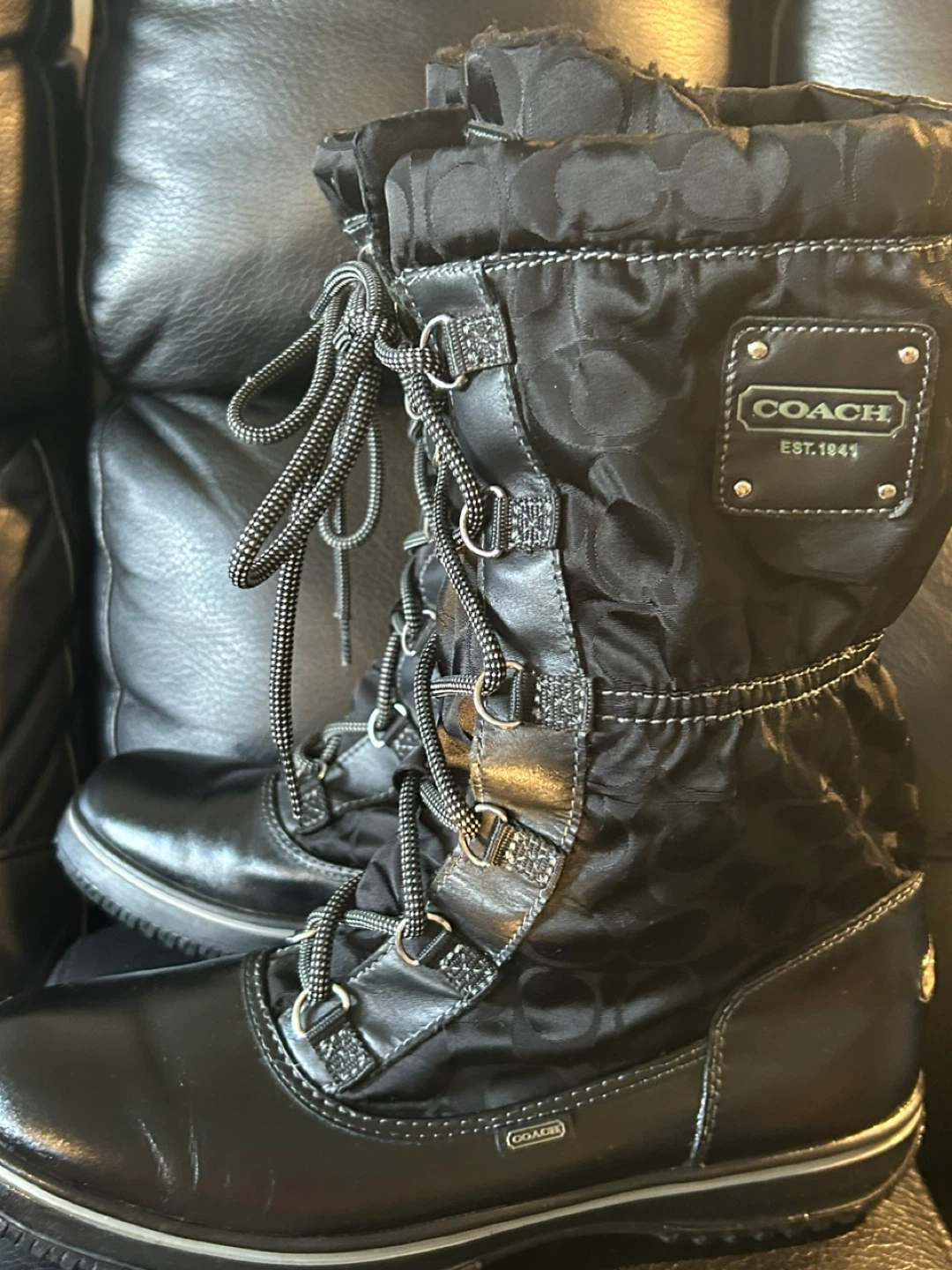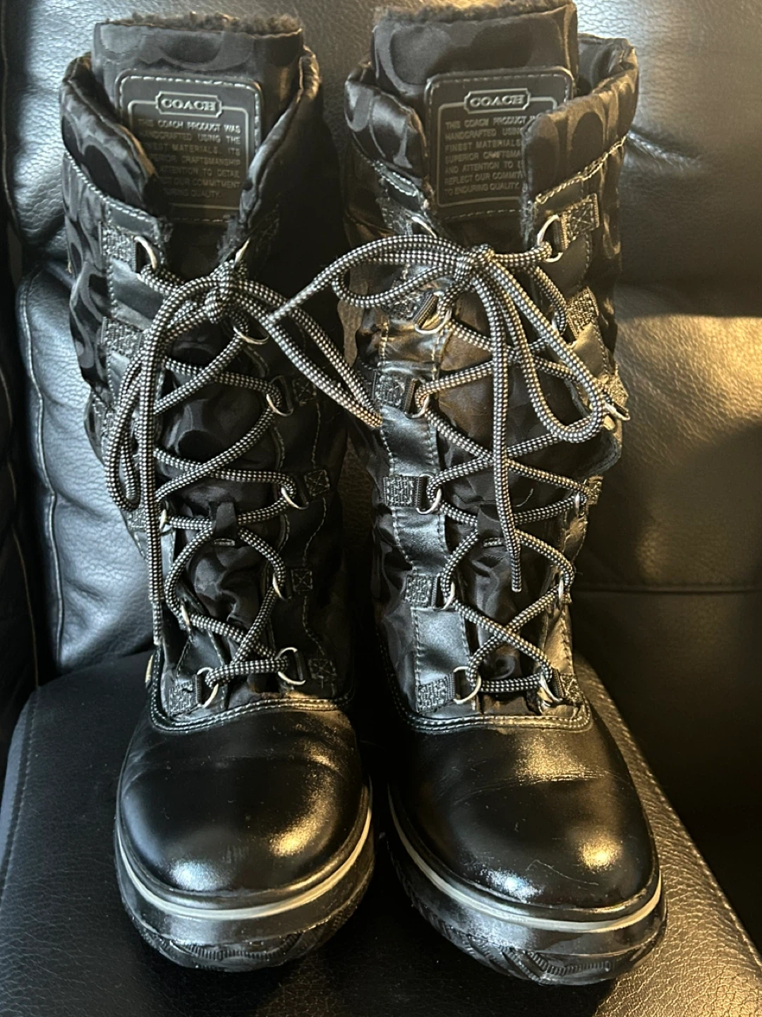 These Coach winter boots are perfect for keeping your feet warm and stylish this winter! They feature the iconic Coach logo pattern, lace-up design, and a durable sole for traction in snowy conditions size 10.5. I don't have the box or cases . open to reasonable offers. I invite you to view my other items; If you are interested in any of them, I will give you a better price.